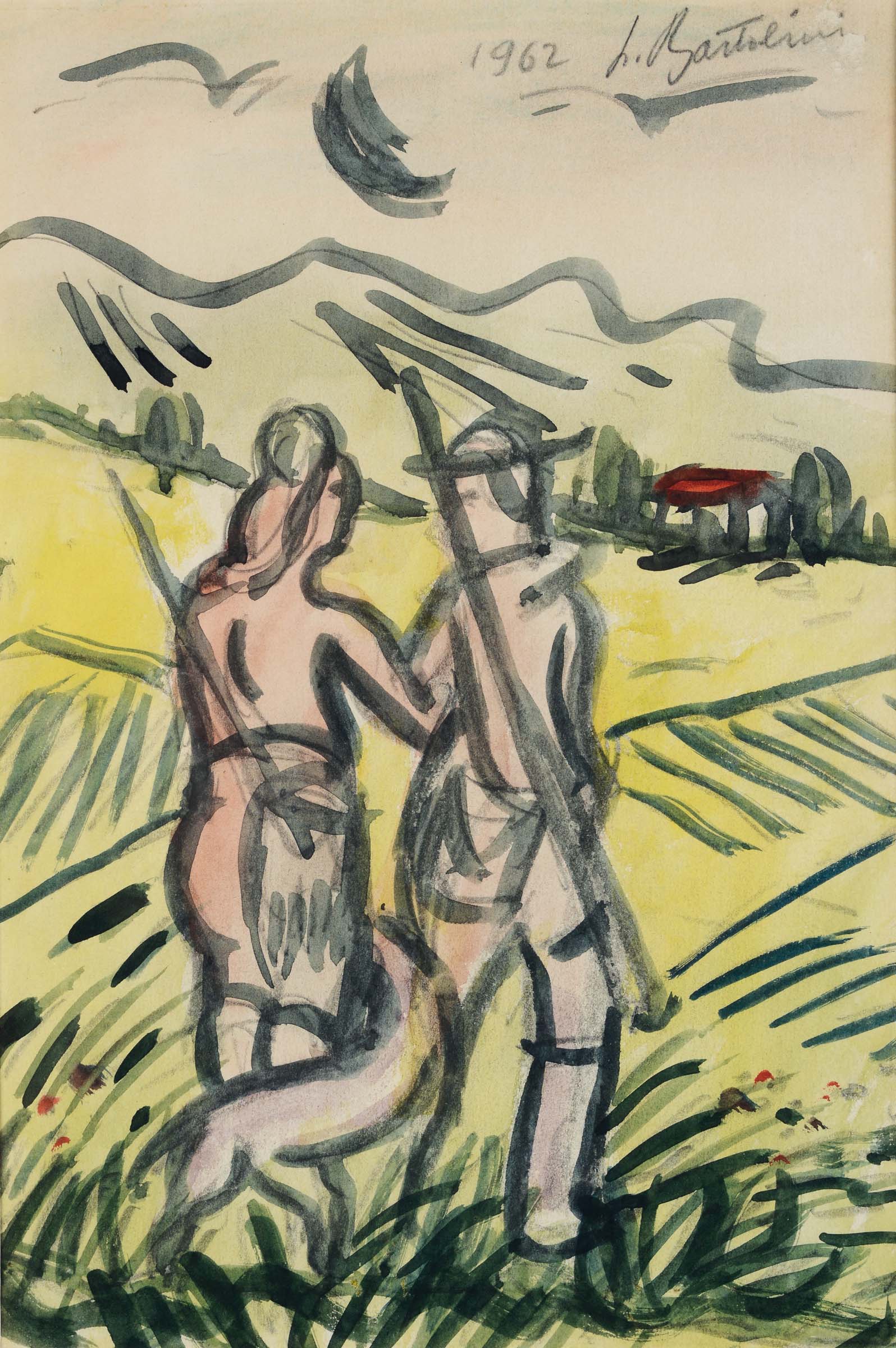 Luigi Bartolini (1892-1963), Cacciatori, 1962 , acquarello su carta intelata, cm. 35x24, firmato e datato in alto a destra