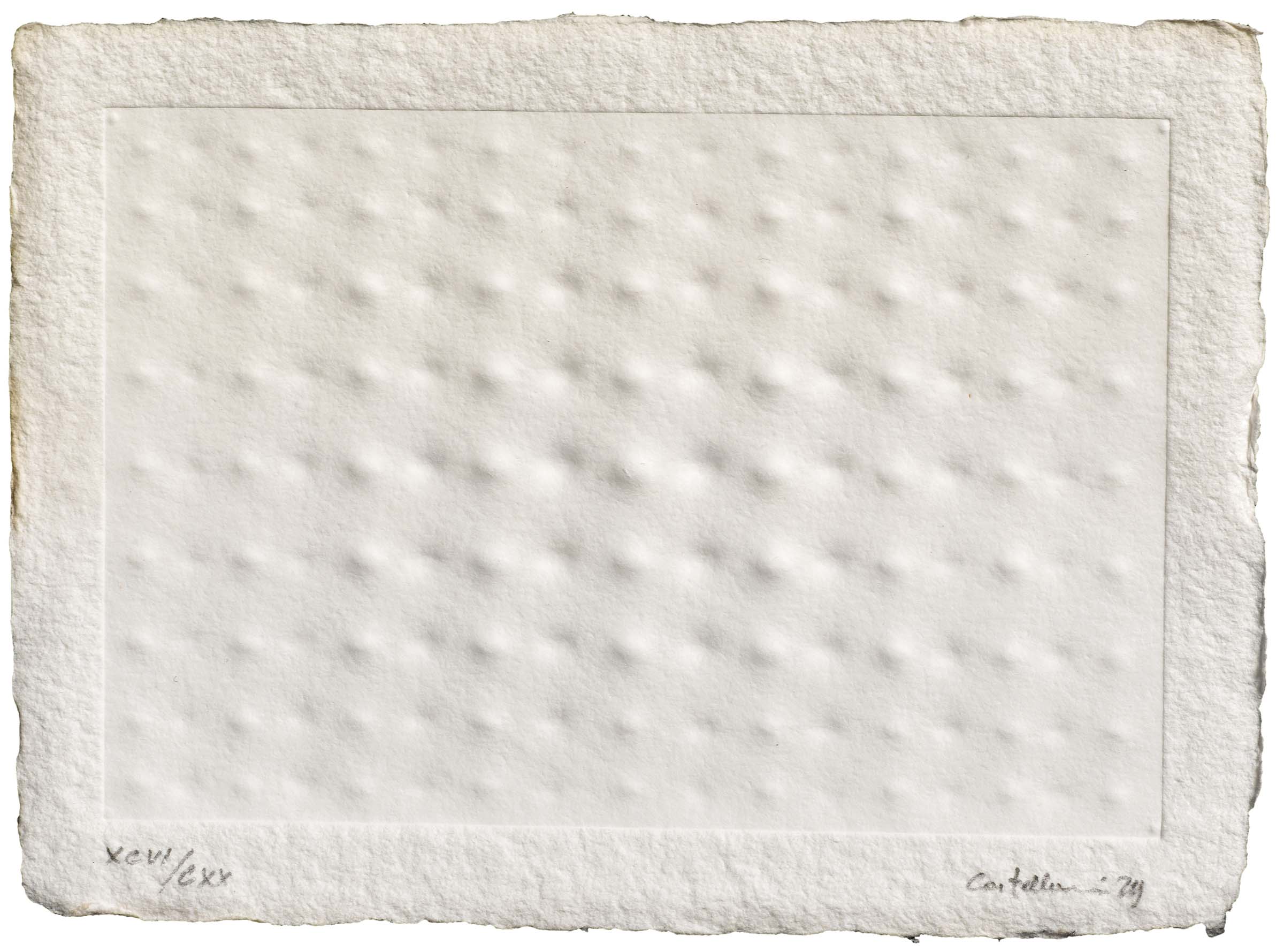 Enrico Castellani (1930), Senza Titolo, incisione su carta a mano, stampatore Lafranca Lugano, es.xxvi/cxx, cm. 15x21, tiratura CXX copie con numeri romani e 120 con numerazione araba, firmate a matita dall’artista. Edizione Plura, Milano