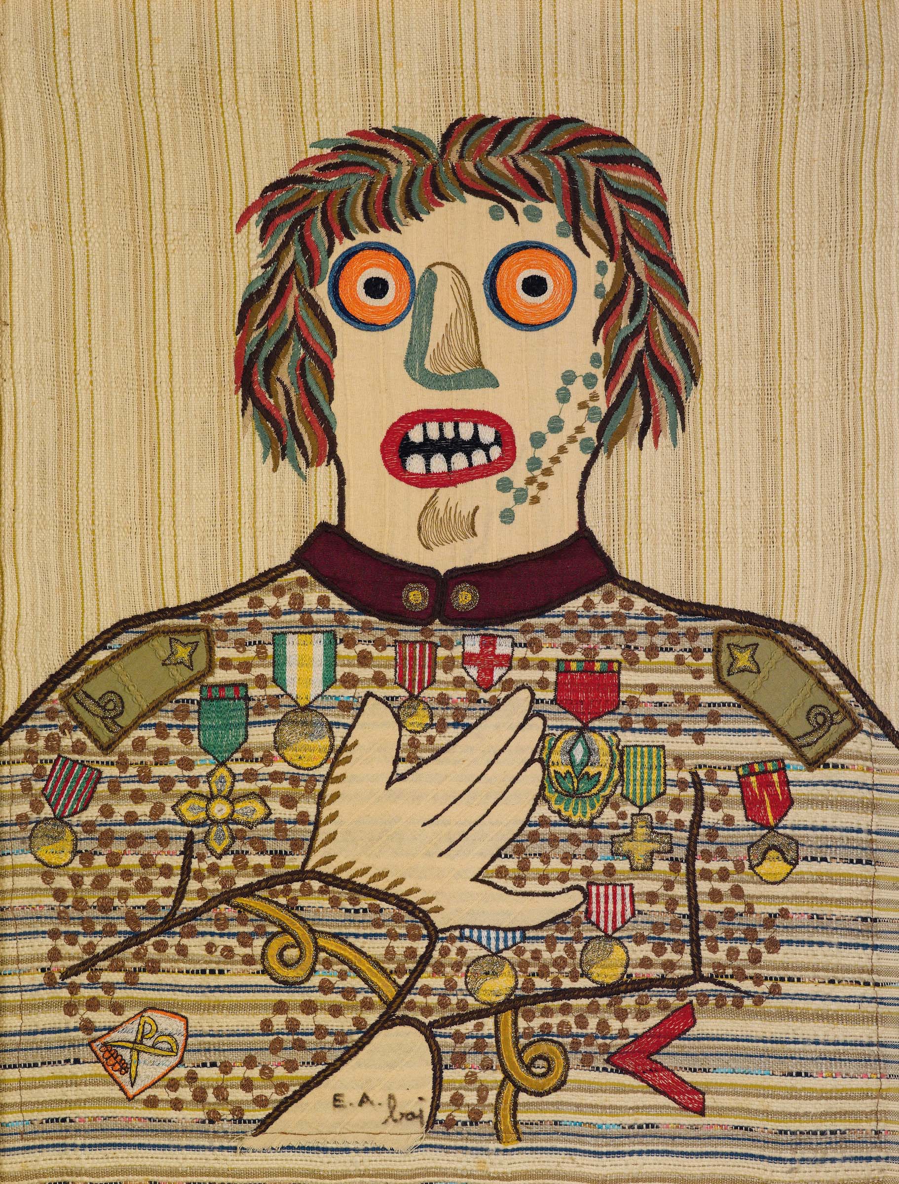 Enrico Baj (1924-2003), Generale, 1976, tessuto rustico con ricami ed inserti...
