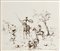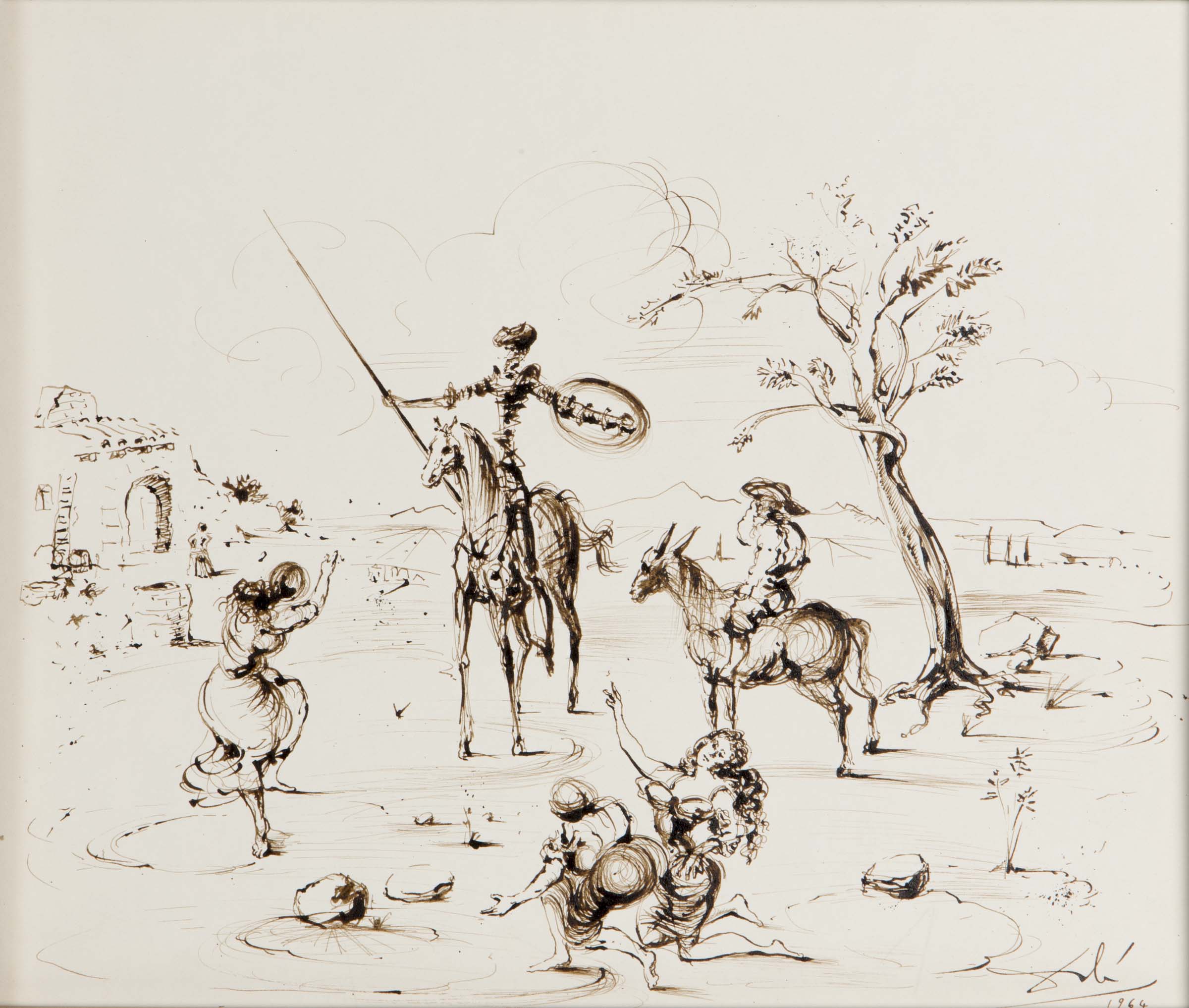 Salvador Dalì (1904-1989), Arrivée de Don Chischotte et Sancho au village, 1964, inchiostro e china su carta, cm 32,5x27,5 Autentica Galleria Cristallo, Cortina d’Ampezzo Provenienza Collezione Albaretto,Torino