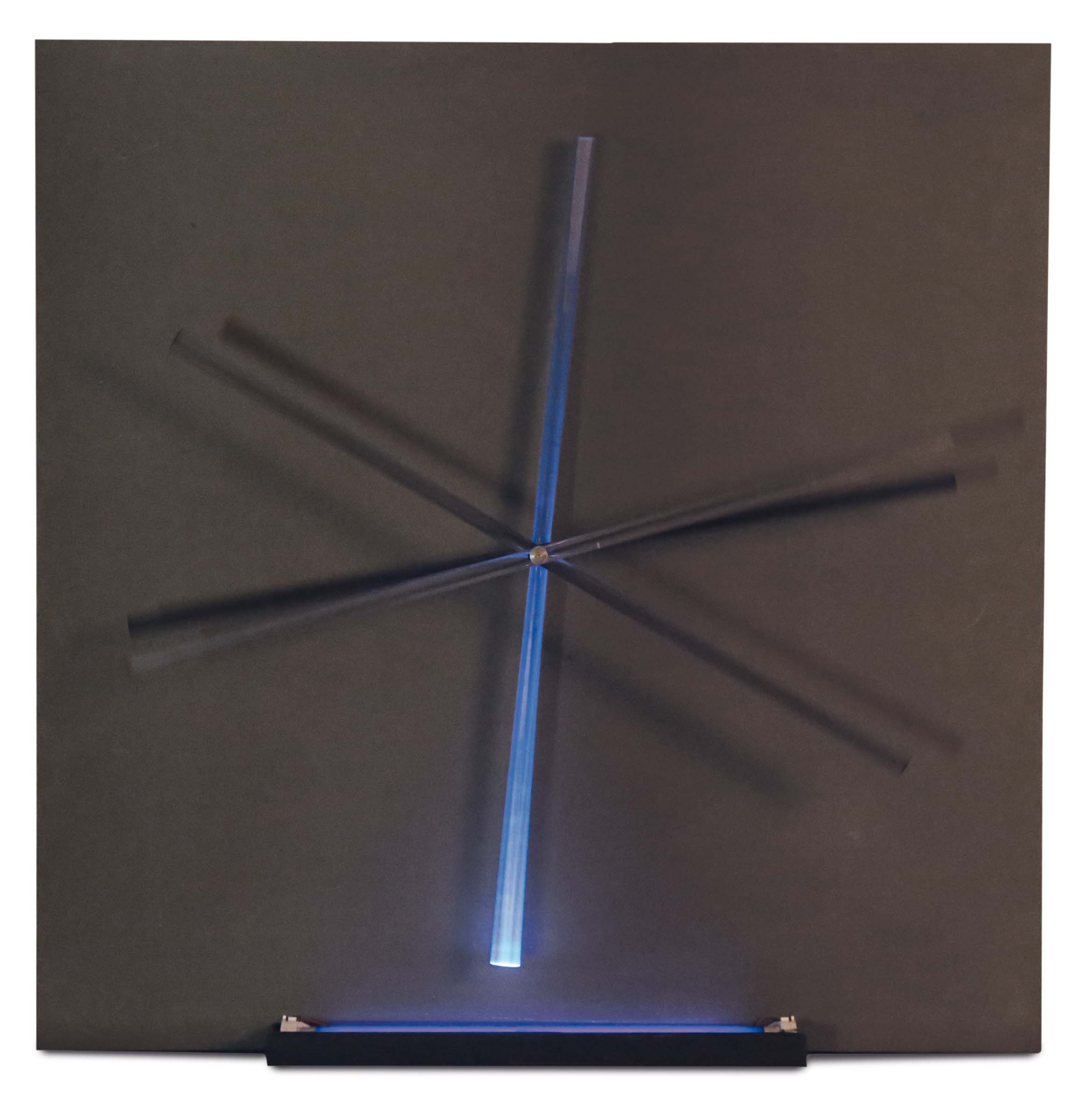 Hugo Demarco (1932-1995), Vitesse Bleu, 1993, installazione luminosa, cm 60x60x13, opera realizzata in 5 esemplari n. 4/5 Autentica su fotografia dell'artista
