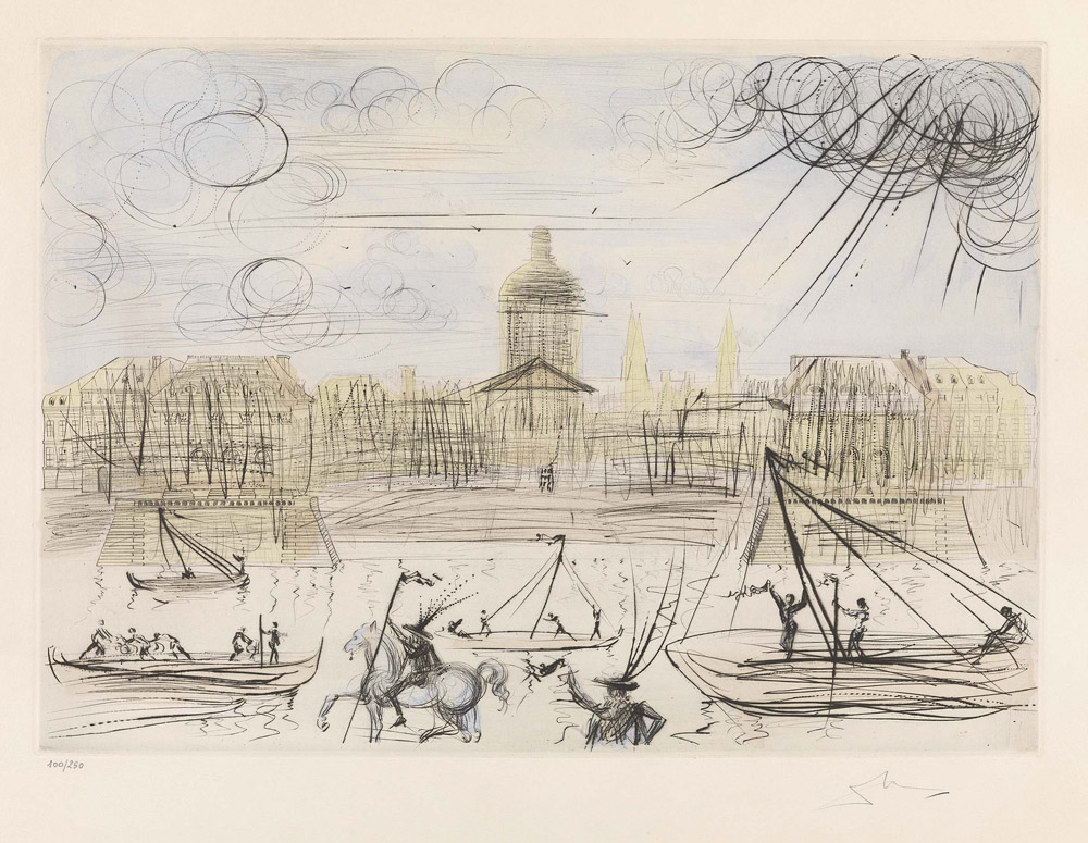 Salvador Dalí, Figueres 1904 - 1989, L'Académie de Paris, 1971, Acquaforte, es. 100/250, cm. 42,5x59,5 (lastra), cm. 59,8x75,7 (carta), Firma a matita sul margine in basso a destra: Dalí, tiratura in basso a sinistra: 100/250., Tiratura di 250 esemplari in numeri arabi, 150 in numeri romani, 350 in nero in numeri arabi, 100 in seppia su carta giapponese, 125 colorati a mano e un indefinito numero di prove; stampatore Atelier 20th Century, editore Amiel., Bibliografia: Salvador Dalí. Catalogue Raisonné of Etchings and Mixed-Media Prints. 1924 - 1980, Edizioni Prestel, 1994, p. 200, n. 514.,