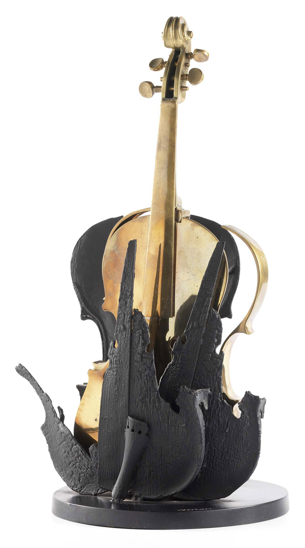 Arman, Nizza 1928 - 2005, La Fenice n. 1, 2004, Scultura in bronzo dorato e a patina scura, multiplo, es. 97/100, cm. 61,5 h., Firma e marchio della fonderia sulla base: Arman / Bocquel fd. 97/100., Tiratura di 100 esemplari in numeri arabi, 10 HC, 20 prove d'artista e 30 esemplari in numeri romani.,