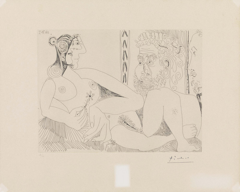 Pablo Picasso, Malaga 1881 - Mougins 1973, Il pittore e la modella, 1971, Acquaforte, es. 20/50, cm. 23x30,7 (lastra), cm. 36,2x45,3 (carta), Data in lastra in alto a sinistra: 1.4.71 I; firma sul margine in basso a destra: Picasso, tiratura in basso a sinistra: 20/50., Tiratura di 50 esemplari in numeri romani e 15 esemplari in numeri arabi., Bibliografia: Georges Bloch, Pablo Picasso. Tome IV Catalogue de l'oeuvre gravé et lithographié 1970-1972, Suppléments tome I + II, Kornfeld et Klipstein, Berne, 1979, p. 137, n. 1959.,