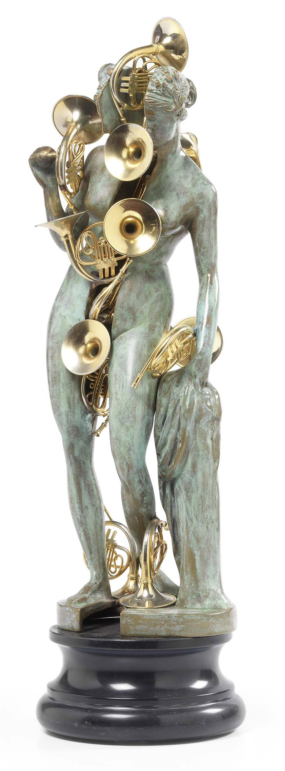 Arman, Nizza 1928 - 2005, Musa della musica, Scultura in bronzo a patina verde e metallo dorato, multiplo, es. 57/100, cm. 48 h., cm. 56,5 h. (con base in marmo nero), Firma e tiratura sulla base: Arman / 57/100.,