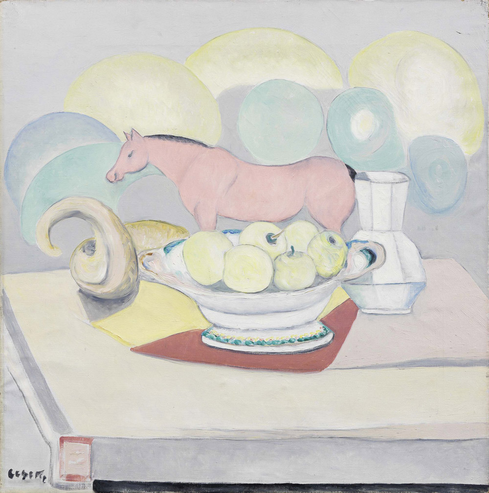 Giuseppe Cesetti, Tuscania (Vt) 1902 - 1991, Natura morta con cavallino, 1974, Olio su tela, cm. 60x60, Firma in basso a sinistra: Cesetti., Bibliografia: Rossana Bossaglia, Paolo Levi, Catalogo generale dei dipinti di Giuseppe Cesetti I° repertorio 1923-1989, Giorgio Mondadori, Milano, 1989, p. 118, n. 74/34.,