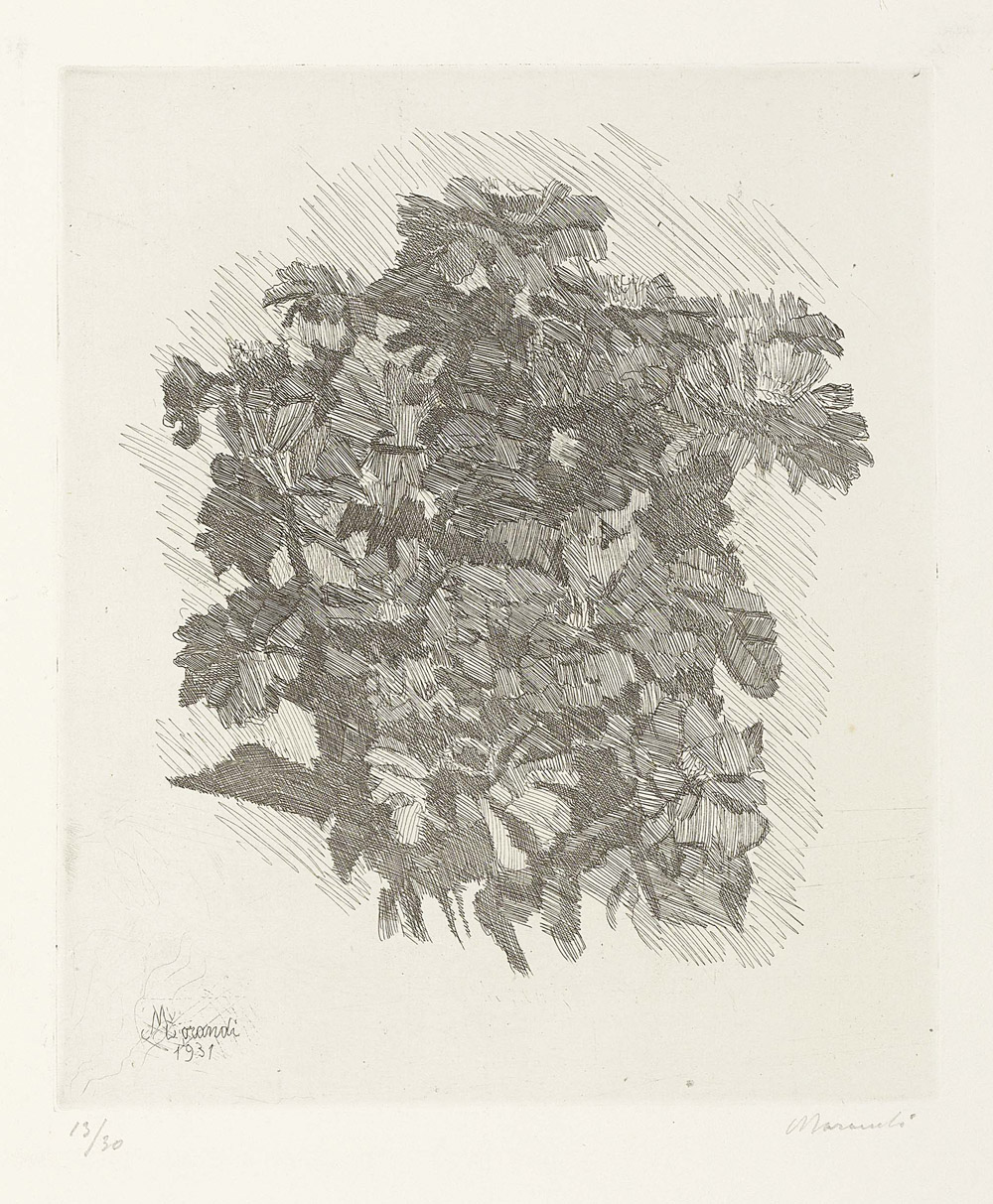Giorgio Morandi, Bologna 1890 - 1964, Gruppo di zinnie, 1931, Acquaforte su zinco, es. 13/30, cm. 22,7x19,1 (lastra), cm. 37x28,3 (carta), Firma e data in lastra in basso a sinistra: Morandi / 1931; firma a matita sul margine in basso a destra: Morandi, tiratura in basso a sinistra: 13/30., Storia: Collezione Giancarlo Pasi, Ravenna, Primo stato su due, tiratura di 30 esemplari numerati e alcune prove di stampa., Bibliografia: Lamberto Vitali, L'opera grafica di Giorgio Morandi, Giulio Einaudi Editore, Torino, 1964, n. 86;, Michele Cordaro, Morandi incisioni. Catalogo Generale, Edizioni Electa, Milano, 1991, p. 98, 1931 6.,