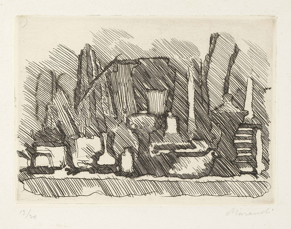 Giorgio Morandi, Bologna 1890 - 1964, Natura morta di vasi, bottiglie ecc. su un tavolo, 1929 ca., Acquaforte su rame su carta India incollata, es. 13/20, cm. 14,5x19,9 (lastra), cm. 24,3x32 (carta), Firma a matita sul margine in basso a destra: Morandi, tiratura in basso a sinistra: 13/20. Al verso, su un cartone di supporto: etichetta Galleria d'Arte Maggiore, Bologna., Storia: Collezione Giancarlo Pasi, Ravenna, Primo stato su due, tiratura di 15 esemplari su carta India incollata, numerati da 1/20 a 15/20., Bibliografia: Lamberto Vitali, L'opera grafica di Giorgio Morandi, Giulio Einaudi Editore, Torino, 1964, n. 66;, Michele Cordaro, Morandi incisioni. Catalogo Generale, Edizioni Electa, Milano, 1991, p. 75, n. 1929 15.,