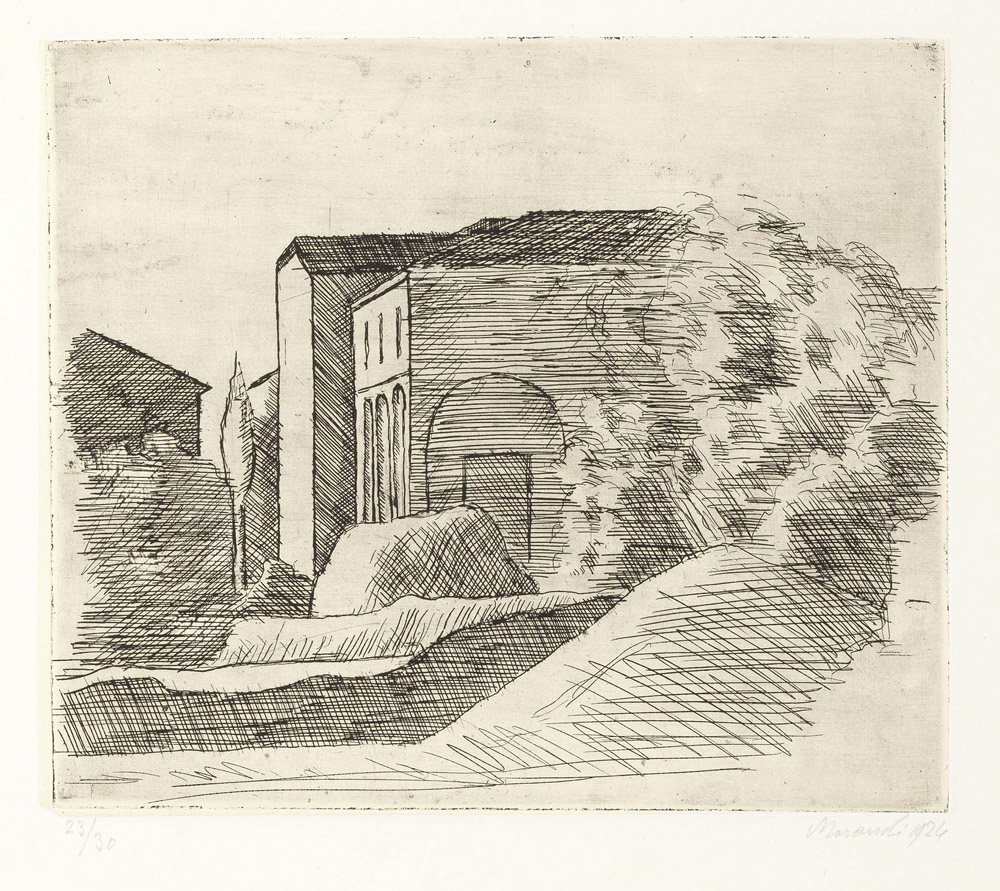 Giorgio Morandi, Bologna 1890 - 1964, La casetta con il portico e il cipresso (lastra grande), 1924, Acquaforte su zinco su carta India incollata, es. 23/30, cm. 20,1x23,5 (lastra), cm. 28,3x43,5 (carta), Firma e data a matita sul margine in basso a destra: Morandi 1924, tiratura in basso a sinistra: 23/30., Storia: Collezione Giancarlo Pasi, Ravenna, Primo stato su due, tiratura di 30 esemplari numerati, di cui alcuni su carta India incollata e due prove., Bibliografia: Lamberto Vitali, L'opera grafica di Giorgio Morandi, Giulio Einaudi Editore, Torino, 1964, n. 21;, Michele Cordaro, Morandi incisioni. Catalogo Generale, Edizioni Electa, Milano, 1991, p. 22, n. 1924 1.,