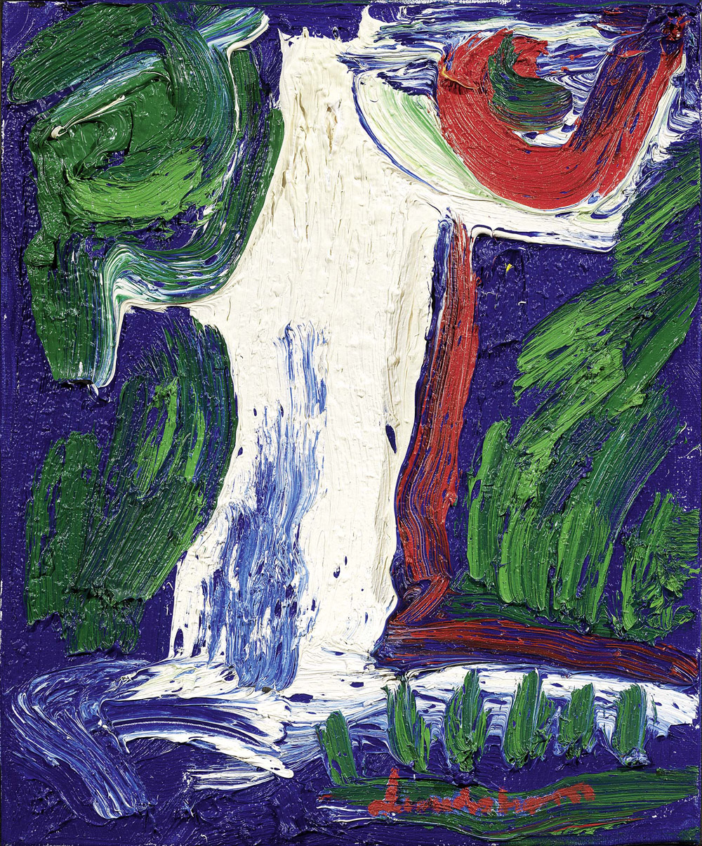 Bengt Lindström, Stoccolma 1925 - 2008, L'homme cascade, 2000, Olio su tela, cm. 46x38, Firma in basso a destra: Lindstrom; numero, data e titolo al verso sulla tela: F.8-2126/2000 / "L'homme cascade"., Due certificati con foto Atelier Bengt Lindström, di cui uno in data 20/12/2007, con n. FO8 2126/00.,
