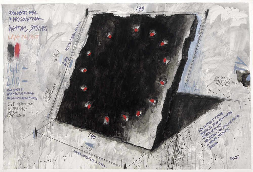 Fabrizio Plessi, Reggio Emilia 1940, Progetto per video scultura - Digital Stones Lava Project, 2007, Tecnica mista su carta applicata su tavola, in teca di plexiglass, cm. 100x150x9 (teca), Firma in basso a destra: Plessi., Foto autenticata dall'artista, Venezia, 14-1-2008., Esposizioni: Fabrizio Plessi, Lava, Cortina d'Ampezzo, Galleria d'Arte Contini, 28 dicembre 2007 - 24 marzo 2008, cat. pp. 38, 39, illustrato a colori.,