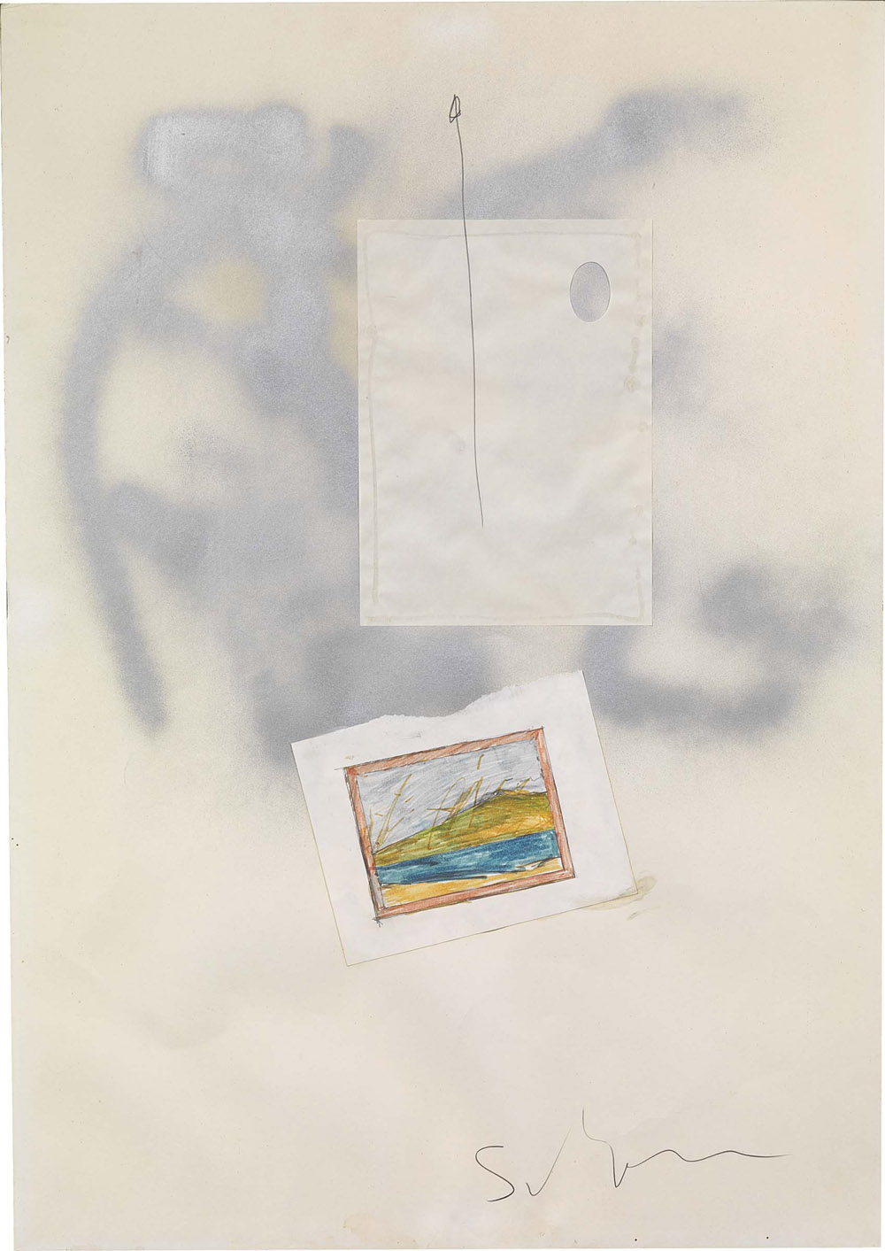Mario Schifano, Homs 1934 - Roma 1998, Senza titolo, Tecnica mista e collage su carta, cm. 100x70, Firma in basso a destra: Schifano.,