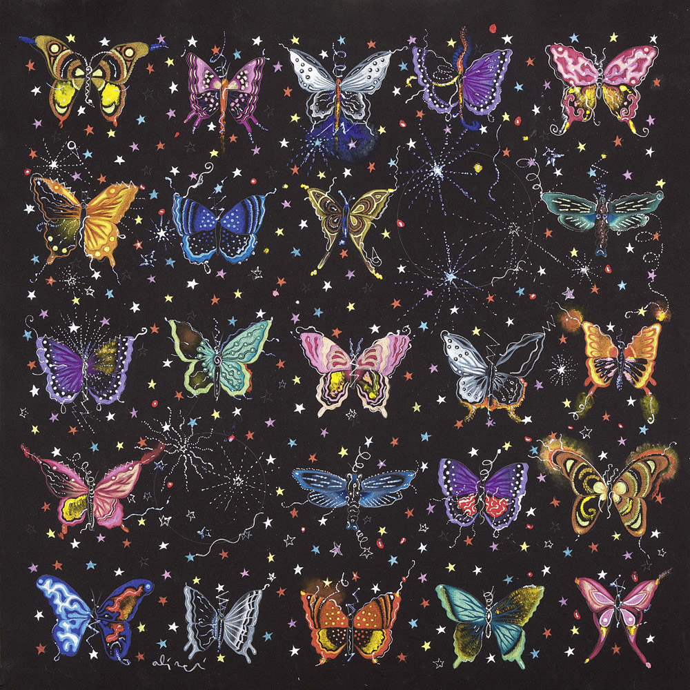 Luca Alinari, Firenze 1943, Farfalle e stelle, 1983, Acrilico su tela tesa su tavola, cm. 89x89,3, Firma in basso a sinistra: Alinari; titolo e data al verso: Farfalle / Butterfly / Farfalle e stelle / 83: etichetta Galerie Adler, Paris.,