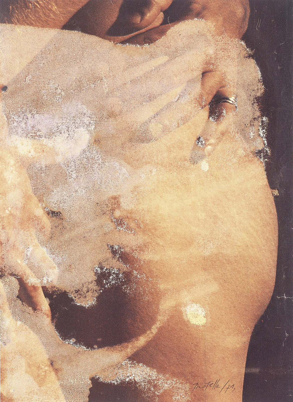 Mimmo Rotella, Catanzaro 1918 - Milano 2006, L'abbraccio, 1973, Effaçage, cm. 27,5x20 (riquadro), Firma e data in basso a destra: Rotella / 73.,