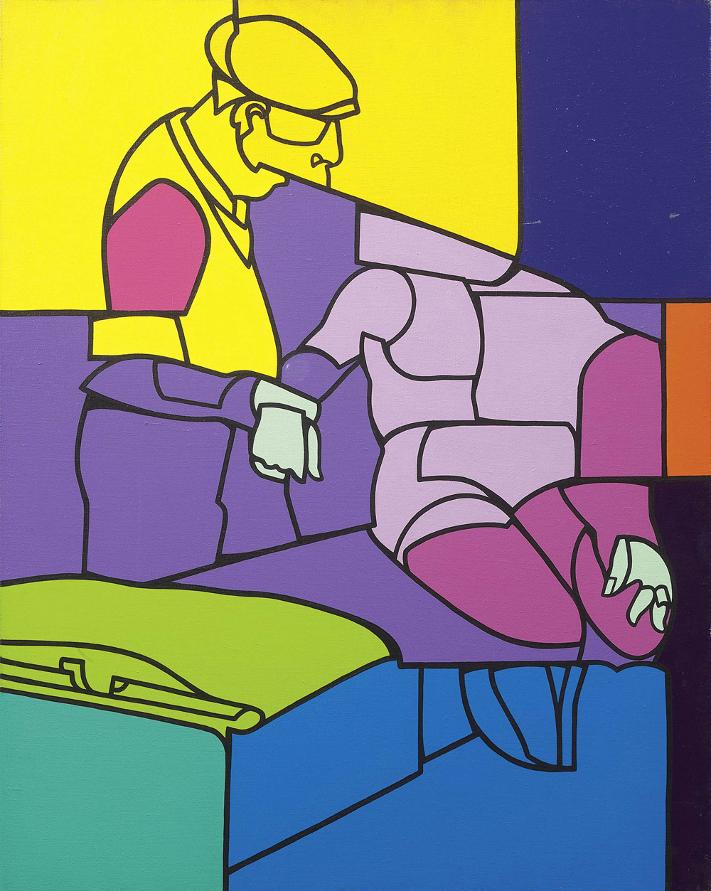 Valerio Adami, Bologna 1935, Studio per Gymnasium, 1974, Acrilico su tela, cm. 92,2x73, Firma, data e titolo al verso sulla tela: Adami / 20.4.74 / 2.8.74 / Studio per / Gymnasium., Foto autenticata dall'artista.,