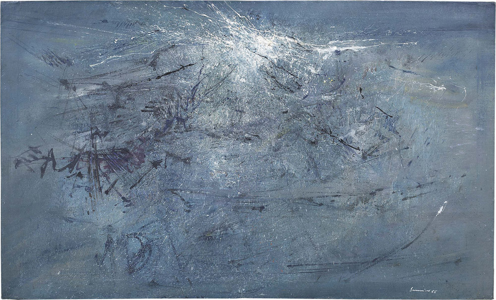 Emilio Scanavino, Genova 1922 - Milano 1986, Il mare in Liguria, 1955, Olio su tela, cm. 91x150, Firma e data in basso a destra: Scanavino 55. Al verso sul telaio: etichetta XXVII Biennale Internazionale d'Arte di Venezia - 1954, con n. 735., Certificato su foto Studio Gastaldelli, Milano, con n. 100/92., Esposizioni: Aspetti dell'informale in Liguria, Genova, Palazzo Reale, Teatro del Falcone, 2 luglio - 30 agosto 1981, cat. tav. 2;, Bianco e Nero, Milano, Studio Gastaldelli, aprile 1986, cat. p. 11, illustrato;, Scanavino. "Evocazione e presenza", Genova, Centro per le Arti Visive e Museo d'Arte Contemporanea, Villa Croce, 1987, cat. p. 34, n. 6, illustrato;, Emilio Scanavino "Opere 1954-1962", Modena, Galleria Civica - Palazzina dei Giardini, 21 gennaio - 25 marzo 1990, cat. p. 27, n. III, illustrato;, Da Monet a Morandi. Paesaggi dello spirito, Conegliano, Palazzo Sarcinelli Galleria Comunale d'Arte, 13 aprile - 15 giugno 1997, cat. p. 133, illustrato a colori., Bibliografia: Carlo Pirovano, Giorgina Graglia Scanavino, Scanavino. Catalogo generale volume primo, Electa, Milano, 2000, p. 74, n. 1955 17.,