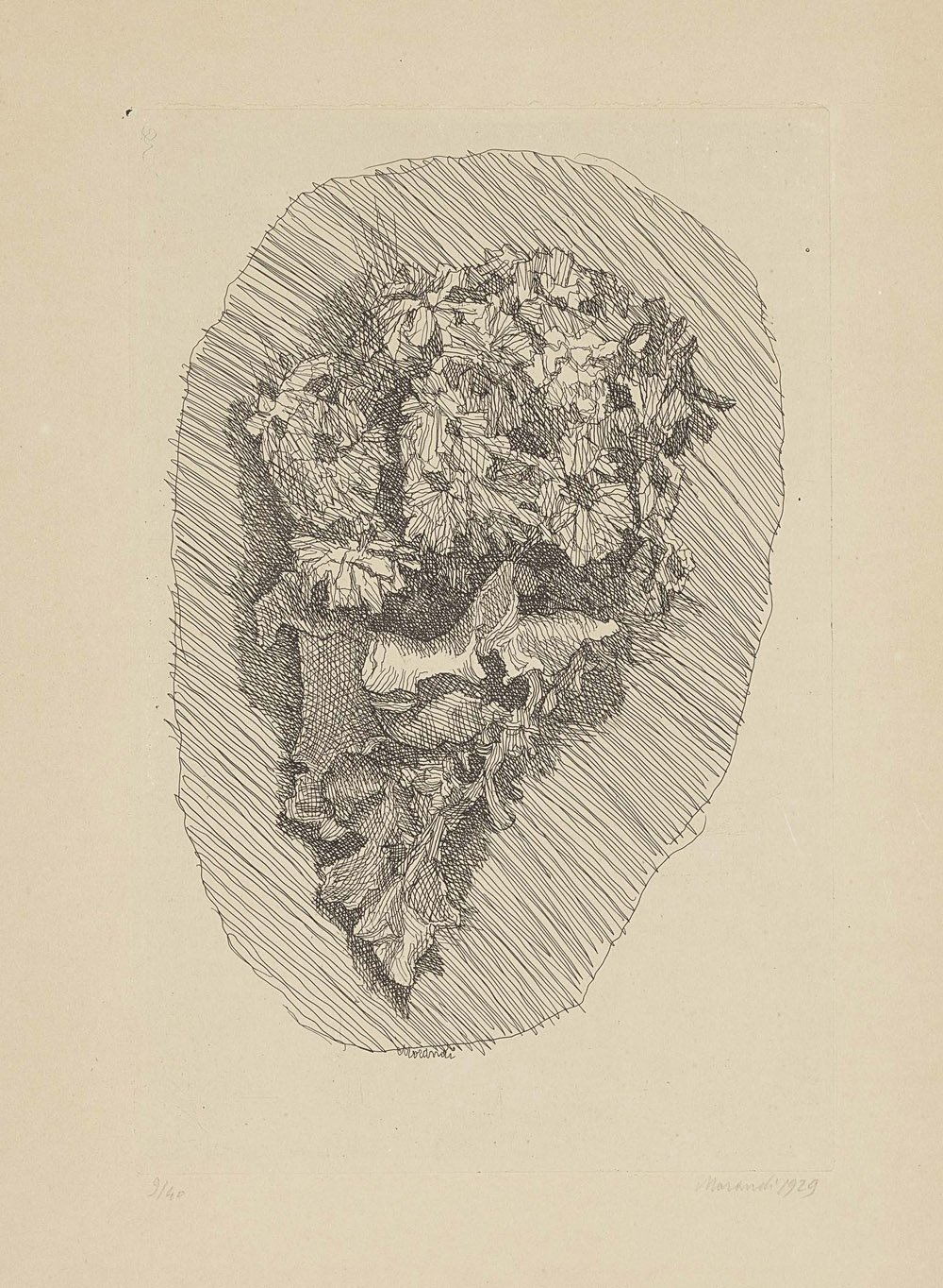 Giorgio Morandi, Bologna 1890 - 1964, Fiori in un cornetto su fondo ovoidale, 1929, Acquaforte su rame, es. 9/40, cm. 29,8x19,7 (lastra), cm. 47,9x32,7 (carta) Firma in lastra in basso al centro: Morandi, firma e data a matita sul margine in basso a destra: Morandi 1929, tiratura in basso a sinistra: 9/40. Primo stato su due; tiratura di 40 esemplari numerati e una prova di stampa. Bibliografia, Lamberto Vitali, L'opera grafica di Giorgio Morandi, Giulio Einaudi Editore, Torino, 1964, n. 63;, Michele Cordaro, Morandi incisioni. Catalogo Generale, Edizioni Electa, Milano, 1991, p. 71, n. 1929 11.