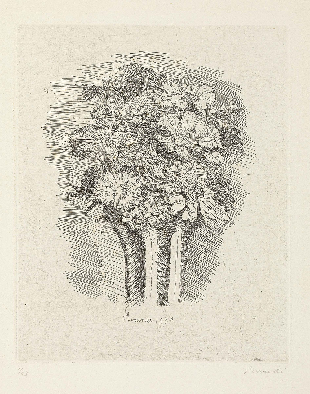 Giorgio Morandi, Bologna 1890 - 1964, Zinnie, 1930, Acquaforte su zinco, es. 1/65, cm. 24,7x19,8 (lastra), cm. 37,8x29,2 (carta) Firma e data in lastra in basso al centro: Morandi 1930, firma a matita sul margine in basso a destra: Morandi, tiratura in basso a sinistra: 1/65. Primo stato su due, tiratura di 65 esemplari numerati, di cui i primi 50 per il volume di Giovanni Scheiwiller, Giorgio Morandi, ed. Chiantore, Torino, e qualche prova. Bibliografia, Lamberto Vitali, L'opera grafica di Giorgio Morandi, Giulio Einaudi Editore, Torino, 1964, n. 72;, Michele Cordaro, Morandi incisioni. Catalogo Generale, Edizioni Electa, Milano, 1991, p. 83, n. 1930 5.