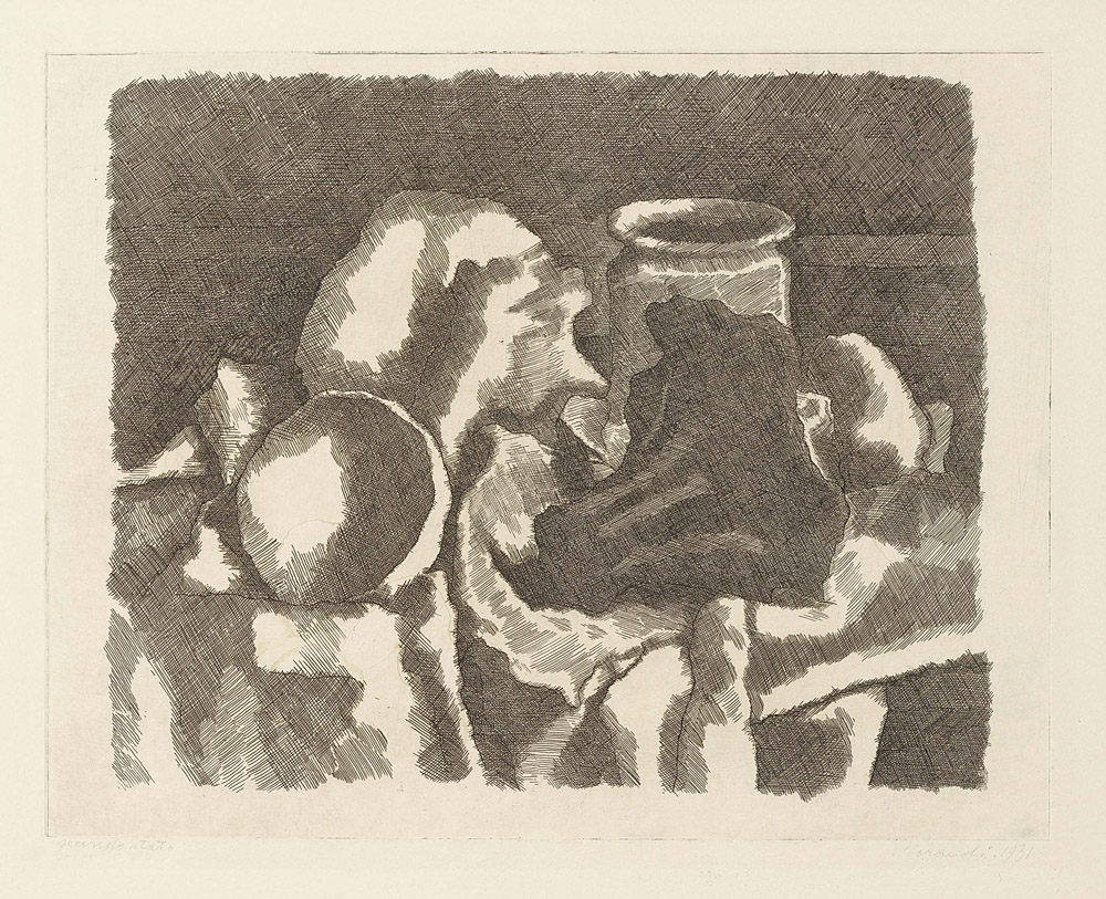 Giorgio Morandi, Bologna 1890 - 1964, Natura morta con il panneggio, 1931, Acquaforte su rame, cm. 24,8x31,6 (lastra), cm. 37,7x47,7 (carta) Firma e data in lastra in basso al centro: Morandi 1931 (poco leggibile), firma e data a matita sul margine in basso a destra: Morandi 1931, scritta in basso a sinistra: secondo stato, timbro a secco: Finarte, Eredità Morandi 1996. Secondo stato su tre, tiratura di 40 esemplari numerati e alcune prove. Bibliografia, Lamberto Vitali, L'opera grafica di Giorgio Morandi, Giulio Einaudi Editore, Torino, 1964, n. 80;, Michele Cordaro, Morandi incisioni. Catalogo Generale, Edizioni Electa, Milano, 1991, p. 93, n. 1931 1.