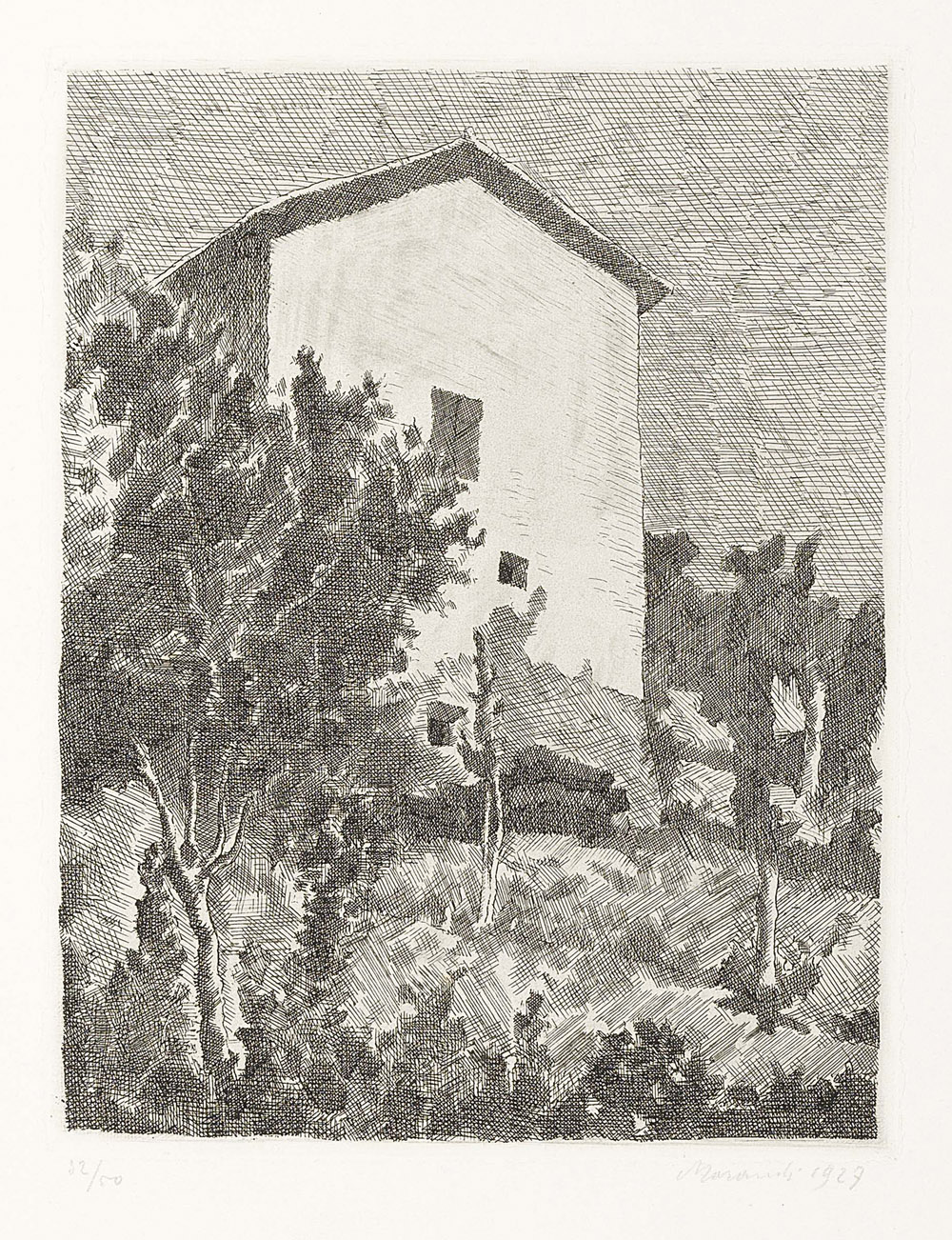 Giorgio Morandi, Bologna 1890 - 1964, Paesaggio (Casa a Grizzana), 1927, Acquaforte su zinco, es. 32/50, cm. 26,1x20 (lastra), cm. 51,2x38 (carta) Firma e data a matita sul margine in basso a destra: Morandi 1927, tiratura in basso a sinistra: 32/50. Secondo stato su tre, tiratura di 50 esemplari di cui 48 numerati dal 3 al 50 e due non numerati. Bibliografia, Lamberto Vitali, L'opera grafica di Giorgio Morandi, Giulio Einaudi Editore, Torino, 1964, n. 32;, Michele Cordaro, Morandi incisioni. Catalogo Generale, Edizioni Electa, Milano, 1991, p. 36, n. 1927 3.
