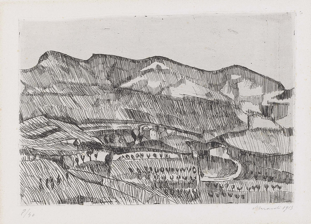 Giorgio Morandi, Bologna 1890 - 1964, Paesaggio. Grizzana, 1913, Acquaforte su zinco, es. 8/40, cm. 15,9x23,2 (lastra), cm. 28x39,7 (carta) Firma e data a matita sul margine in basso a destra: Morandi 1913, tiratura in basso a sinistra: 8/40. Al verso, su un cartone di supporto: etichetta Galleria d'Arte Maggiore, Bologna. Primo stato su due; tiratura di 40 esemplari numerati e alcune prove di stampa. Bibliografia, Lamberto Vitali, L'opera grafica di Giorgio Morandi, Giulio Einaudi Editore, Torino, 1964, n. 2;, Michele Cordaro, Morandi incisioni. Catalogo Generale, Edizioni Electa, Milano, 1991, p. 4, n. 1913 1.