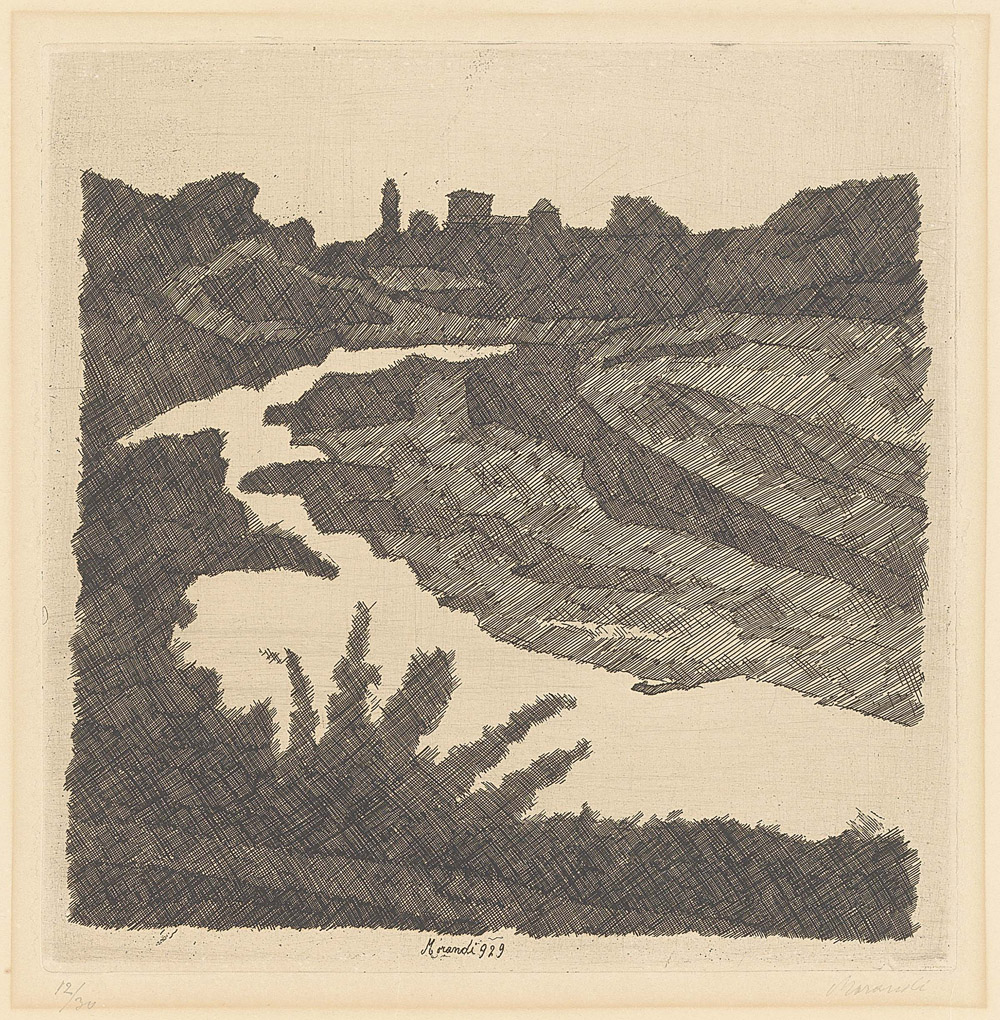 Giorgio Morandi, Bologna 1890 - 1964, Paesaggio sul Savena, 1929, Acquaforte su rame, es. 12/30, cm. 25,3x24,7 (lastra), cm. 32,5x49 (carta) Firma e data in lastra in basso al centro: Morandi 929, firma a matita sul margine in basso a destra: Morandi, tiratura in basso a sinistra: 12/30. Primo stato su due, tiratura di 30 esemplari numerati oltre due prove di stampa. Bibliografia, Lamberto Vitali, L'opera grafica di Giorgio Morandi, Giulio Einaudi Editore, Torino, 1964, n. 57;, Michele Cordaro, Morandi incisioni. Catalogo Generale, Edizioni Electa, Milano, 1991, p. 65, n. 1929 5.