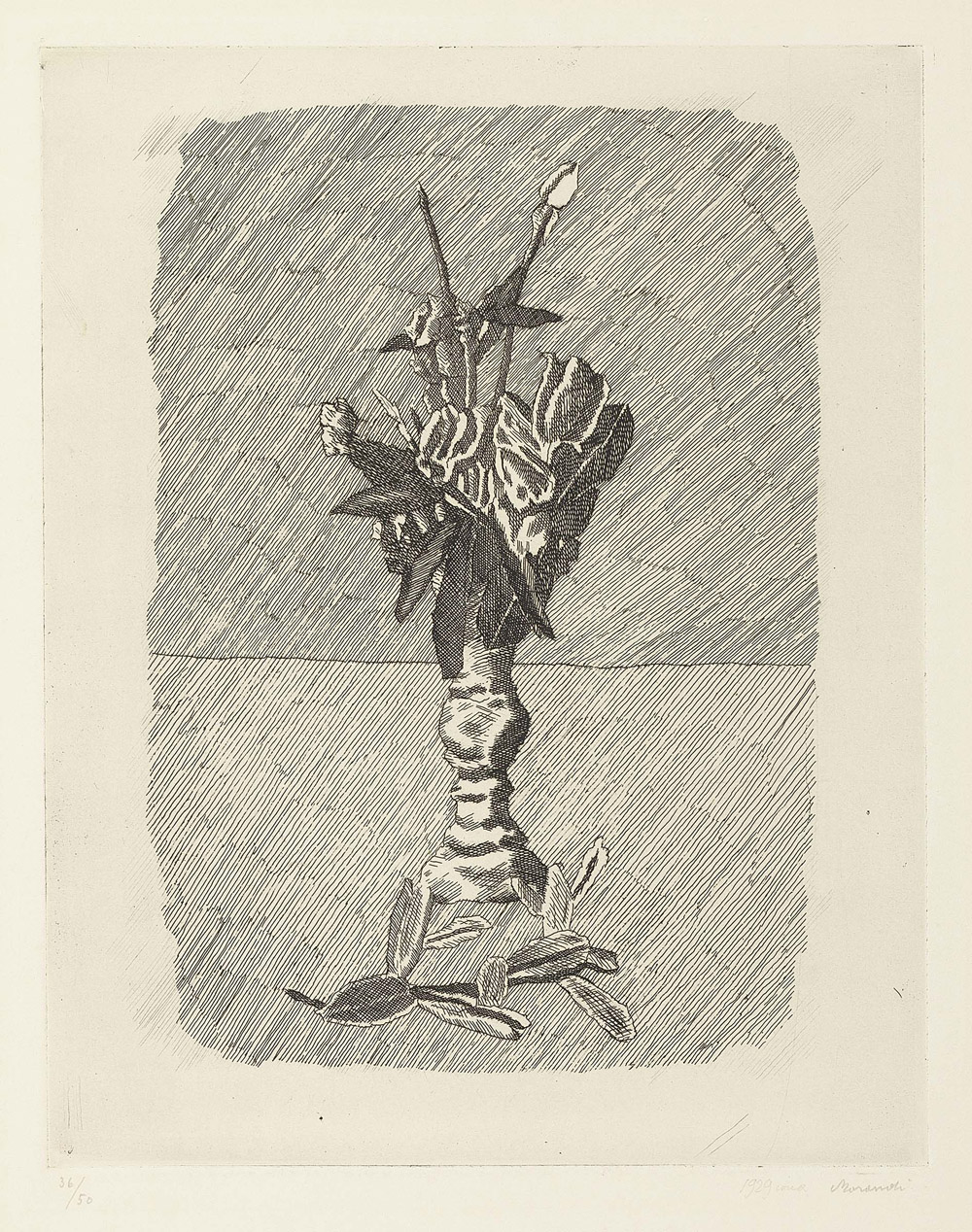 Giorgio Morandi, Bologna 1890 - 1964, Rose in boccio in un vaso, 1929, Acquaforte su rame, es. 36/50, cm. 31,7x25 (lastra), cm. 40,5x32 (carta) Data e firma a matita sul margine in basso a destra: 1929 circa Morandi, tiratura in basso a sinistra: 36/50: timbro a secco Libreria Prandi, Reggio Emilia. Secondo stato su due, tiratura di 50 esemplari numerati. Bibliografia, Lamberto Vitali, L'opera grafica di Giorgio Morandi, Giulio Einaudi Editore, Torino, 1964, n. 88 (opera datata 1931);, Michele Cordaro, Morandi incisioni. Catalogo Generale, Edizioni Electa, Milano, 1991, p. 78, n. 1929 18.