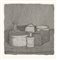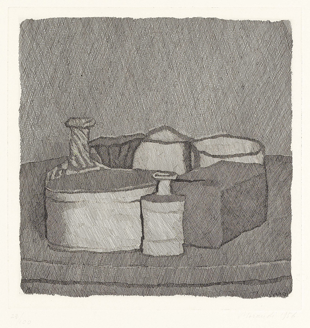 Giorgio Morandi, Bologna 1890 - 1964, Natura morta con quattro oggetti e tre bottiglie, 1956, Acquaforte su rame, es. 23/100, cm. 19,9x20,3 (lastra), cm. 39x28,4 (carta) Firma e data a matita sul margine in basso a destra: Morandi 1956, tiratura in basso a sinistra: 23/100. In cofanetto di tela verde, con astuccio contenente il volume Giorgio Morandi. Opera grafica, a cura di Lamberto Vitali, Torino, Einaudi, 1957, es. 23/1000., Secondo stato su due, tiratura di 10 esemplari numerati I/X per l'artista e 100 esemplari numerati 1/100 per le copie di lusso del volume, più 6 prove di stampa. Bibliografia, Lamberto Vitali, L'opera grafica di Giorgio Morandi, Giulio Einaudi Editore, Torino, 1964, n. 117, Michele Cordaro, Morandi incisioni. Catalogo Generale, Edizioni Electa, Milano, 1991, p. 135, n. 1956 2.
