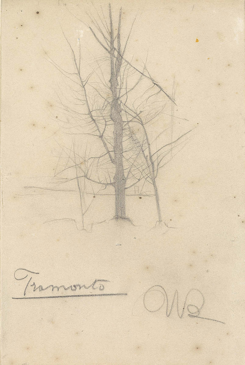 Umberto Boccioni, Reggio Calabria 1882 - Sorte (Vr) 1916, Tramonto, (1908), Matita su carta, cm. 16x24,2 Sigla in basso a destra: UB, titolo in basso a sinistra: Tramonto. Al verso, su un cartone di supporto: etichetta parzialmente abrasa Civica Galleria d'Arte Moderna / Mostra Boccioni 1933 / Un albero / n. [79]. Storia, Bottega di Poesia, Milano;, Collezione Taidelli, Milano;, Collezione privata, Milano;, Collezione privata Parere orale favorevole di Ester Coen. Esposizioni, Mostra retrospettiva di Boccioni, Milano, Civica Galleria d'Arte Moderna, estate 1933.