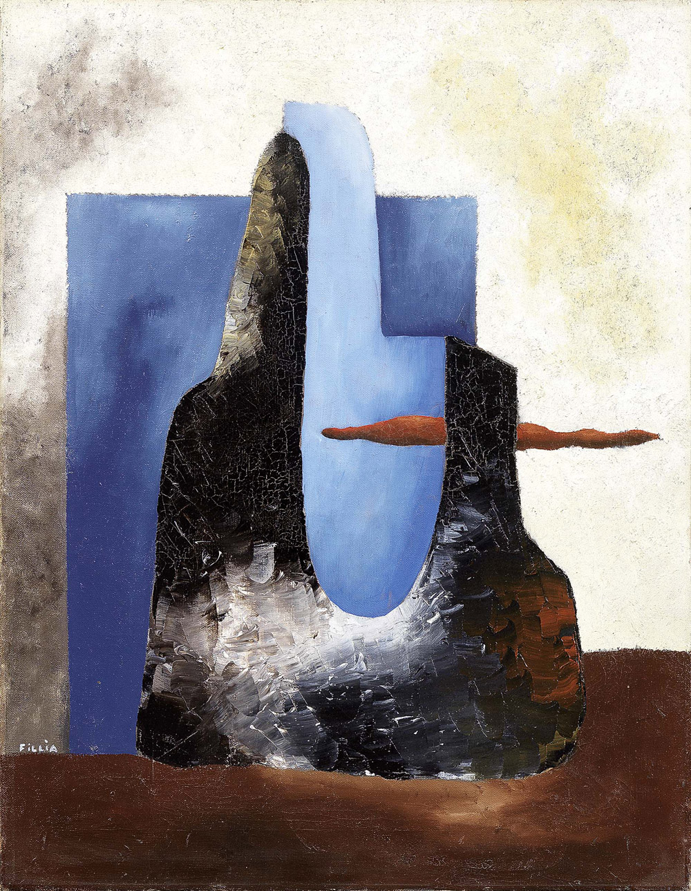 Fillia, Revello (Cn) 1904 - Torino 1936, Composizione plastica (Valori plastici di un paesaggio), 1931, Olio su tela, cm. 65x50 Firma in basso a sinistra: Fillia. Al verso sulla tela: etichetta e timbro Centro Rizzoli / Milano / Mostra Fillia / data 26.10.76/ 23.11.76: cartiglio con dati dell'opera (opera datata 1929); sul telaio: etichetta Comune di Cuneo. Assessorato per la cultura / Fillia fra immaginario meccanico e primordio / cosmico / Museo Civico in S. Francesco, 14 maggio - 30 giugno / 1988, con n. 25: etichetta parzialmente abrasa Galleria Civica d'Arte Moderna - Torino / Mostra Secondo Futurismo Torinese. Storia, Collezione Elio Benoldi, Torino;, Collezione privata, Torino;, Collezione privata Esposizioni, Mostra delle opere di Fillia, Torino, Galleria Mastarone, 8 - 31 maggio 1956, cat. n. 3 (opera datata 1929);, Mostra postuma del pittore futurista Fillia, Roma, Galleria dell'Incontro, dal 4 giugno 1956;, Aspetti dell'arte torinese, Torino, Galleria Narciso, 30 aprile - 15 maggio 1960, cat. p. 75, n. 28, tav. 75, illustrato;, Aspetti del Secondo Futurismo torinese, Torino, Galleria Civica d'Arte Moderna, 27 marzo - 30 aprile 1962, cat. p. 66, n. 32, tav. V, illustrato a colori;, 120ª Esposizione Regionale 1962, Torino, Società Promotrice Belle Arti, 24 maggio - 24 giugno 1962, sala VI, cat. p. 37, n. 16 (opera datata 1929);, Fillia, Torino, Galleria La Bussola, dall'8 gennaio 1966, cat. n. 54, illustrato;, Fillia, Biella, Galleria Mercurio, 5 - 23 ottobre 1966, cat. n. 52;, Fillia, Torino, Galleria d'Arte Narciso, 6 maggio - 12 giugno 1976, cat. n. 16, illustrato;, Fillia, Milano, Centro Rizzoli, 26 ottobre - 23 novembre 1976;, Fillia, Genova, Il Vicolo, 27 novembre - 31 dicembre 1976, cat. n. 16, illustrato;, Fillia: Pittore futurista 1904-1936, Torino, Galleria Narciso, 17 ottobre - 30 novembre 1986;, Fillia fra immaginario meccanico e primordio cosmico, a cura di Enrico Crispolti, Cuneo, San Francesco, 14 maggio - 30 giugno 1988, cat. p. 112, n. 52, illustrato; Bibliografia, Albino Galvano, Arte Astratta, in Almanacco Letterario Bompiani, Milano, 1959, pp. 82-84;, Enrico Crispolti, Il Secondo Futurismo, Torino 1923/1938, Ediz. Fratelli Pozzo, Torino, 1961, tav. XVI;, Marzio Pinottini, Fillia, All'insegna del pesce d'oro, Milano, 1976, p. 129, n. 20, tav. 20;, Fillia e l'avanguardia futurista negli anni del fascismo, a cura di Silvia Evangelisti, Arnoldo Mondadori Editore / Edizioni Philippe Daverio, Milano, 1986, p. 268, n. 146.