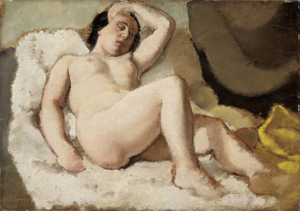 Felice Carena, Cumiana (To) 1879 - Venezia 1966, Nudo, 1933, Olio su cartone applicato su tavola, cm. 70,5x100,5 Firma e data in basso a sinistra: Carena / 1933. Al verso sulla tavola: due timbri F.lli Orler, Favaro Veneto. Certificato su foto F.lli Orler, Favaro Veneto, con n. 16. Esposizioni, Omaggio a Felice Carena, Padova, Galleria d'Arte Anteriore, 29 novembre - 12 dicembre 1969, cat. p. n.n., illustrato.
