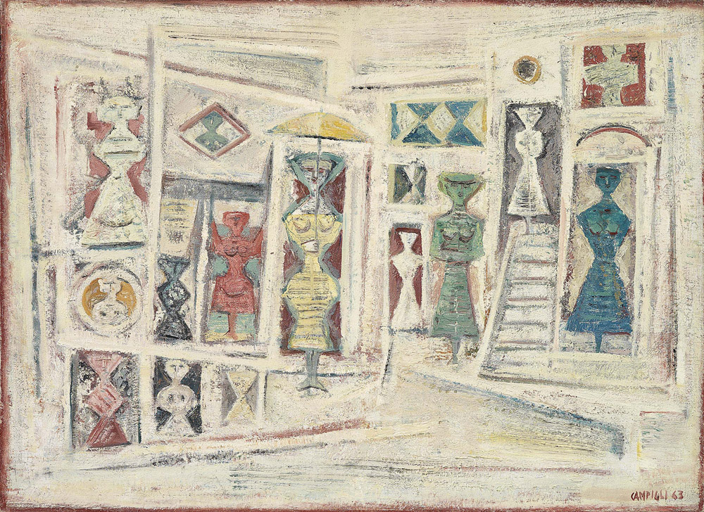 Massimo Campigli, Berlino 1895 - St.Tropez 1971, Maison / Casa mia / Case, 1963, Olio su tela, cm. 74x100 Firma e data in basso a destra: Campigli 63. Al verso sulla tela: etichetta e quattro timbri Galleria d'Arte Delux / Arte Contemporanea / Milano, con n. 78: timbro Galleria d'Arte / La Tavolozza / Palermo: timbro Galerie Stangl / München: timbro F.lli Orler / Favaro V.to; sul telaio: etichetta Galerie Stangl / München: timbro Galleria / Gissi / Torino, con n. 2837: timbro Arte Contemporanea / Delux / Arte Contemporanea / Milano: timbro Galleria d'Arte / La Tavolozza / Palermo: timbro Galleria Medea / Milano. Storia, Moderne Galerie Otto Stangl, Monaco;, Galleria Gissi, Torino;, Collezione privata, Firenze;, Collezione privata Esposizioni, Campigli, Monaco, Moderne Galerie Otto Stangl, 24 settembre - 9 novembre 1963;, Campigli, Roma, Galleria d'Arte Zanini, 29 gennaio - 19 febbraio 1966, cat. n. 6 (con titolo Donne del sultano e data 1965);, La donna memoria ed emblema di M. Campigli, Torino, Galleria Gissi, giugno 1968, cat. n. 24, illustrato a colori;, Omaggio a Massimo Campigli, Cortina d'Ampezzo, Galleria d'Arte Medea, 13 agosto - 26 agosto 1971, cat. p. 27, illustrato a colori;, Massimo Campigli, Roma, Galleria Dimensione, 1972, cat. p. n.n., illustrato;, Massimo Campigli, Palermo, Galleria La Tavolozza, febbraio 1972, cat. n. 11, illustrato;, Omaggio a Campigli, Torino, Galleria d'Arte "La Bussola", 11 - 28 marzo 1972, cat. tav. 20, illustrato a colori. Bibliografia, Nicola Campigli, Eva Weiss, Marcus Weiss, Campigli, catalogue raisonné, vol. II, Silvana Editoriale, Milano, 2013, p. 794, n. 63-070.