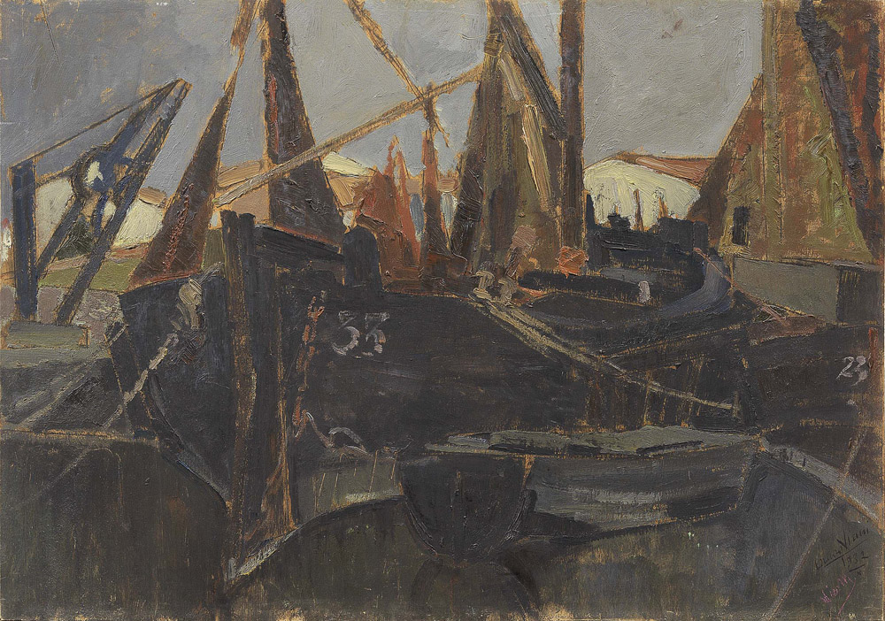 Lorenzo Viani, Viareggio (Lu) 1882 - Ostia (Roma) 1936, La darsena dell'Artiglio, 1932, Olio su compensato, cm. 60x84,5 Firma e data in basso a destra: Lorenzo Viani / 1932 / Viani. Al verso: due etichette, di cui una con n. 195, XVIII Esposizione Biennale Internazionale d'Arte - Venezia 1932. Esposizioni, XVIII Biennale di Venezia, 1932, sala 18, cat. p. 75, n. 23.