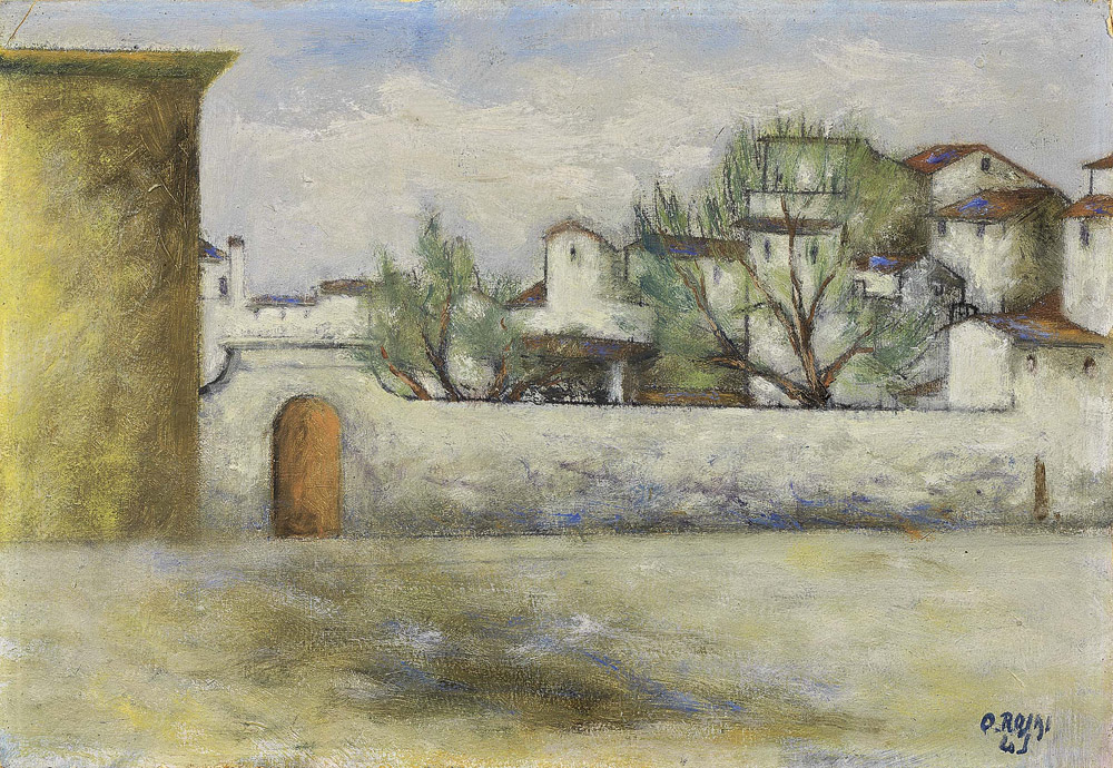 Ottone Rosai, Firenze 1895 - Ivrea (To) 1957, Piazza del Carmine, 1945, Olio su cartone, cm. 31,6x46 Firma e data in basso a destra: O. Rosai / 45; titolo e data al verso: Piazza del Carmine / 45: etichetta Centenario della nascita 1895-1995 / Ottone Rosai / Antologica - 200 opere dal 1913 al 1957 / Farsettiarte / Prato - 23 settembre / 22 ottobre 1995 / Cat. n. 158: timbro Galleria d'Arte Colongo, Biella. Certificato su foto Galleria d'Arte Sergio Colongo, Biella. Esposizioni, Ottone Rosai, 200 opere dal 1913 al 1957, a cura di Luigi Cavallo, Prato, Farsettiarte, 23 settembre - 22 ottobre 1995, poi Milano, Palazzo Reale, 26 ottobre 1995 - 6 gennaio 1996, cat. n. 158, illustrato a colori.