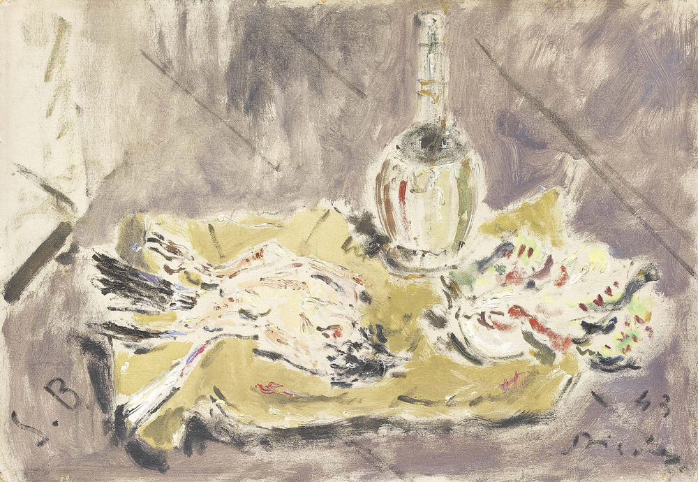 Filippo de Pisis, Ferrara 1896 - Milano 1956, Natura morta con polli e fiasco, 1943, Olio su tela applicata su cartone, cm. 44,7x64,4 Data e firma in basso a destra: 43 / Pisis, sigla in basso a sinistra: S.B. Bibliografia, D. Cugini, Ricordi di F. de Pisis, in La Rivista di Bergamo, Bergamo, maggio, 1956, p. 10;, Giuliano Briganti, De Pisis. Catalogo generale, tomo secondo, opere 1939-1953, con la collaborazione di D. De Angelis, Electa, Milano, 1991, p. 624, n. 1943 50.