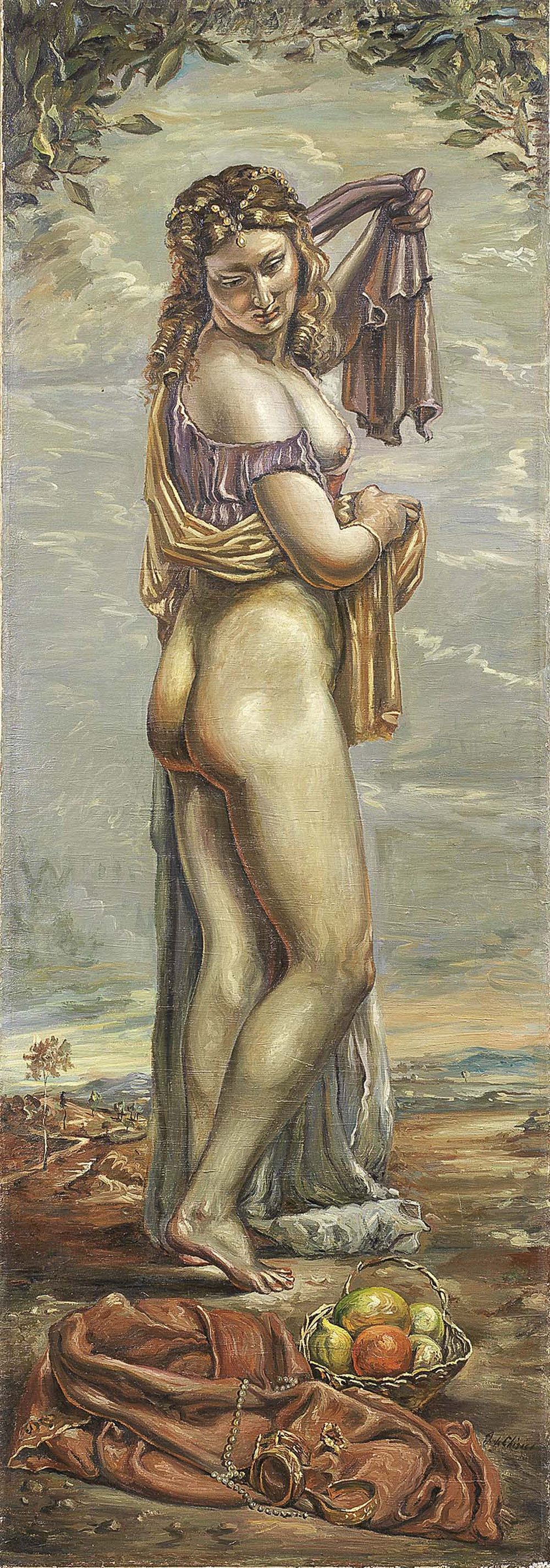 Giorgio de Chirico, Volos 1888 - Roma 1978, Autunno, 1946, Olio su tela, cm. 205x73 Firma in basso a destra: G. de Chirico; firma al verso sulla tela: Giorgio de Chirico: dichiarazione di autenticità del notaio De Gloria, Montecatini Terme, 18 settembre 1962. Storia, Collezione Generale Martini, Torino;, Collezione privata, Padova Esposizioni, De Chirico, il Barocco, dipinti degli anni '30-50, a cura di Luigi Cavallo e Maurizio Fagiolo dell'Arco, Farsettiarte, Focette, Cortina d'Ampezzo, Milano, luglio - settembre 1991, cat. tavv. VII, VII/a, VII7b, VII/c, illustrato a colori;, Metafisico Primo Il Grande, Giorgio de Chirico e qualche amico pittore, Soffici, De Pisis, Carrà, Morandi, Rosai, Bologna, Galleria d'Arte Maggiore, novembre 2004 - gennaio 2015, cat. pp. 102-103, n. 6, illustrato a colori;, Giorgio de Chirico, Il labirinto dei sogni e delle idee, Aosta, Centro Saint-Bénin, 29 aprile - 30 settembre 2012, cat. p. 56, illustrato a colori. Bibliografia, Claudio Bruni Sakraischik, Catalogo Generale Giorgio de Chirico, volume secondo, opere dal 1931 al 1950, Electa Editrice, Milano, 1972, n. 150 (con misure errate);, Domenico Porzio, Isabella Far de Chirico, Conoscere de Chirico, la vita e l'opera dell'inventore della pittura metafisica, A. Mondadori Editore, Milano, 1979, p. 296, n. 218.