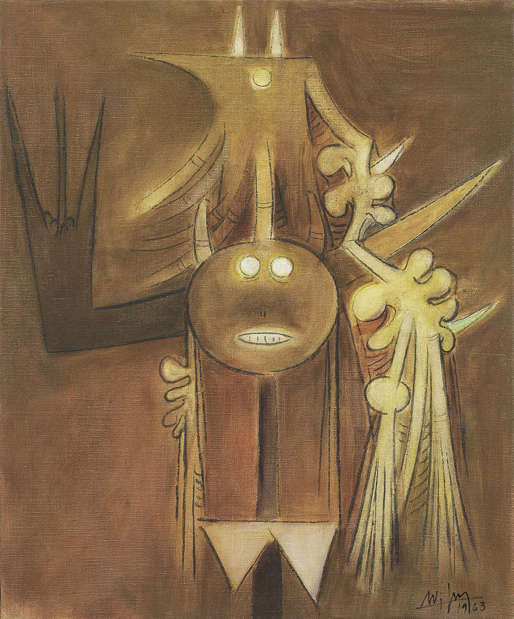 Wifredo Lam, Sagua La Grande 1902 - Parigi 1982, Senza titolo, 1963, Olio su tela, cm. 60,5x50 Firma e data in basso a destra: Wi. Lam / 1963; firma al verso sulla tela: Wi Lam. Storia, Collezione privata, Milano;, Collezione privata Bibliografia, Wifredo Lam. Catalogue Raisonné of the Painted Work. Volume II 1961 - 1982, Acatos, Losanna, 2002, p. 271, n. 63.18.