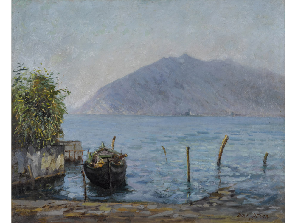 Dino Decca (Brescia 1935- 1999) Mattino sul lago d'Iseo Olio su tela Firmato Misure 40x50 cm