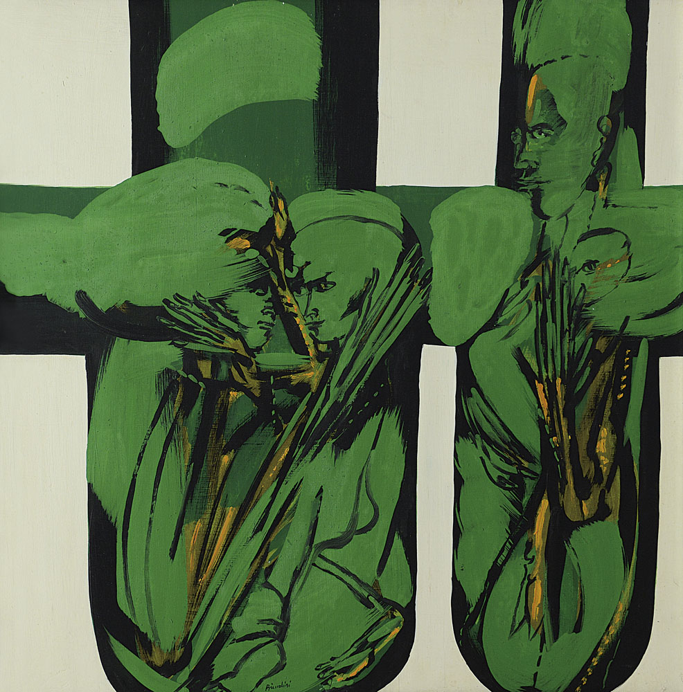 tecnica mista e olio su tavola cm. 60x60, firma in basso al centro, etichetta con archivio n° 4116 a cura della Galleria Pace (MI) al retro, opera registrata presso l'Archivio per il Catalogo Generale di Remo Brindisi come da dichiarazione a cura della Galleria Pace (MI) su foto.