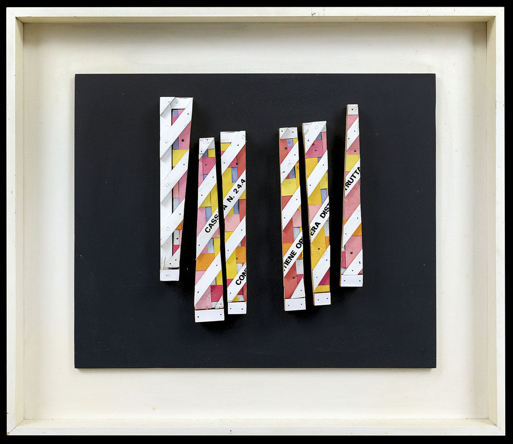 tecnica mista, collage e applicazioni di legni su tavola cm 45x55 entro cassetta in legno cm 64x74x5,5; firma e timbro dell'Archivio Storico Cavellini al retro, dichiarazione d'autenticità dell'artista e timbro dell'Archivio Storico Cavellini su foto, certificato d'autenticità della ArteTivù (Favaro V.to-VE) allegato.