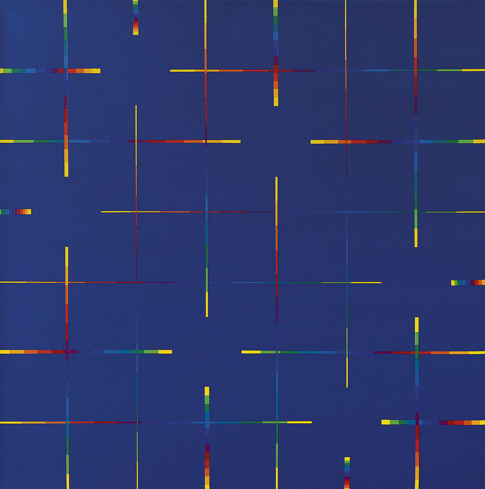 Delle arti delle stelle "Poema stupito", 1989 acrilico su tela cm 60x60x3, firma, titolo, anno etichetta e timbri della Galleria Lagorio Arte (Brescia) al retro, dichiarazione d'autenticità dell'artista su foto, opera priva di cornice.