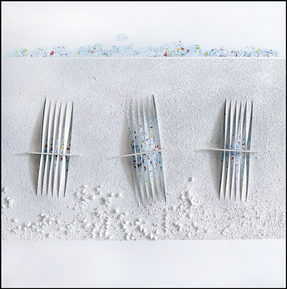 assemblaggio su tavola e tela cm 55x55, firma e anno al retro, dichiarazione d'autenticità e numero di registro su foto.