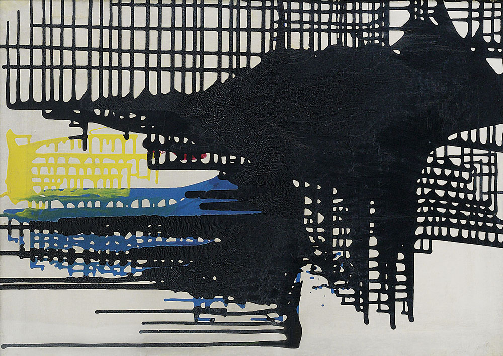 olio e tecnica mista su tela cm 50x70, firma in basso a destra, timbro della Collezione Schettini ed etichette della Galleria Schettini (MI) e della Galleria Borgogna al retro.