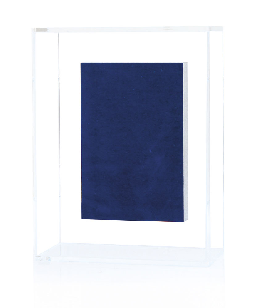 pigmento su pietra serena, blu 23100 cm 27x14x3, firma, anno e archivio al retro, dichiarazione d'autenticità dell'artista su foglio A4 allegato, certificato della Galleria Orler allegato, entro teca in plexiglass.