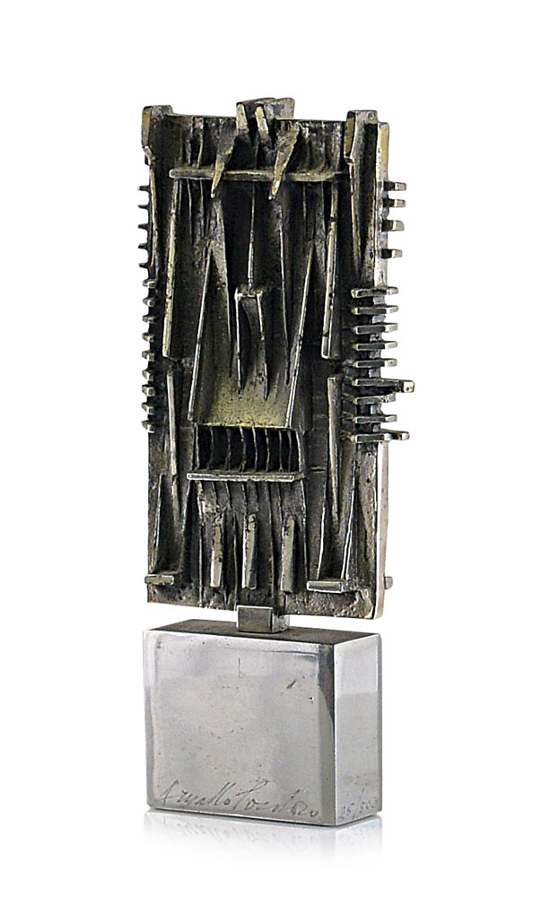 scultura in bronzo argentato cm 17,8x7x2,9; esemplare 26/300, firma e tiratura incisi alla base, opera realizzata per il Gruppo Finsider (marchio inciso alla base), tiratura registrata presso l'Archivio Pomodoro al n° M/77/7, certificato di garanzia ed autenticità della Casati Arte Contemporanea (Muggiò-MB) allegato.