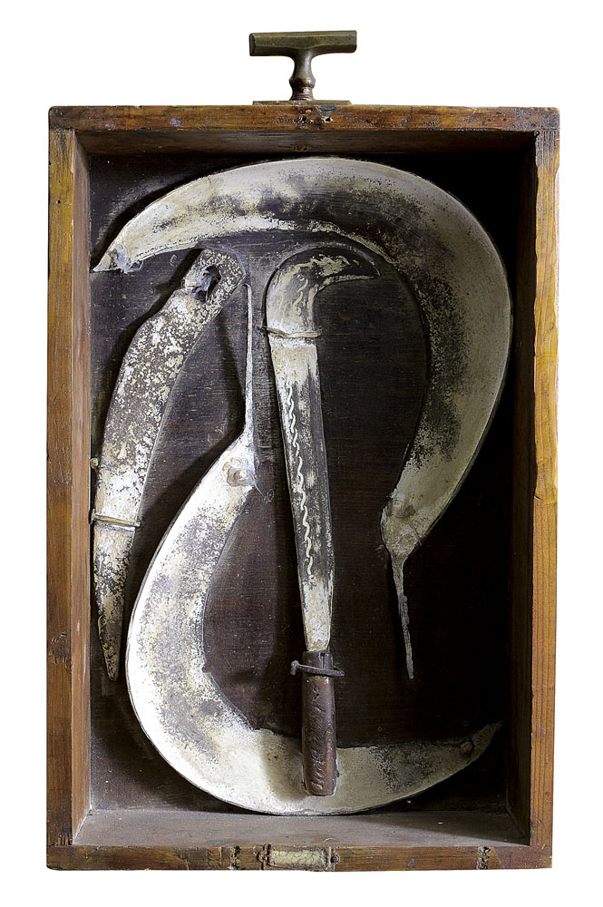 tecnica mista e applicazioni di falci entro cassetto in legno con maniglia in metallo cm. 62x37,5x12,6; firma, anno e timbro della Galleria Rinaldo Costa (GE) al retro, timbro e firma per autentica della Galleria d'Arte Rinaldo Rotta (GE) su foto, esposto alla Mostra Personale tenutasi Presso la Galleria Rinaldo Rotta (GE) nel maggio 2002 e nell'esposizione "Arturo", tenutasi a Santa Margherita presso l'Albergo Imperiale.