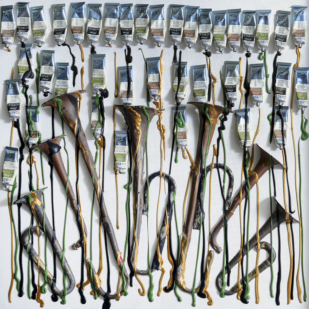 applicazioni di tubetti, strumenti musicali e colore su tela applicata su tavola cm 80x80, firma sul bordo inferiore, dichiarazione d'autenticità dell'artista e Archivio delle Opere di Arman a cura della Galleria Dante Vecchiato (PD) su Certificato per un'opera di Arman allegato.