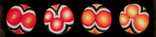 Yagi Senza titolo - 2008 legni, vetro, cerchi di filo colorato con cornice invasa cm. 120x30x2,5 Su supporti di legno dipinto di nero, si aprono quattro teche di vetro circolari contenente ciascuna una composizione realizzata con filo tessuto. Le teche sono aperte e visibili su entrambi i lati Firma in basso a dx