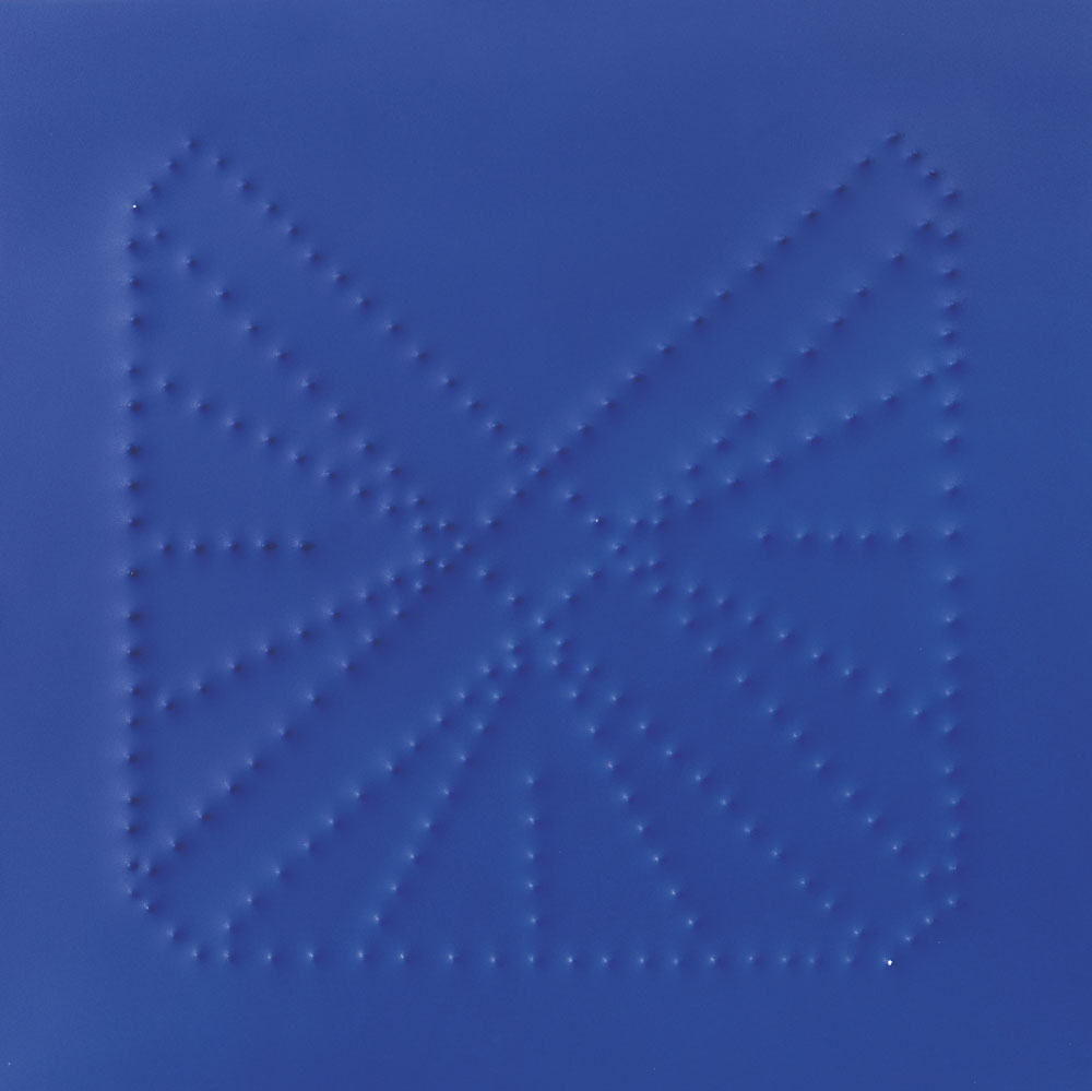 n° 241 spari di pistola cal. 22 su lastra in alluminio (colore blu) montata su telaio in legno cm 100x100x5, firma e tecnica al retro, dichiarazione d'autenticità dell'artista su foto, opera priva di cornice.