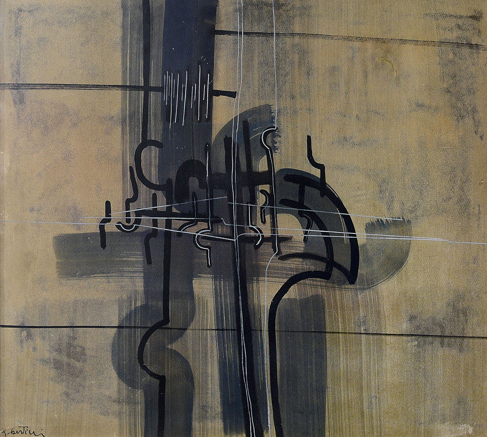 tecnica mista su carta intelata cm 50x55, firma in basso a sinistra, firma e anno al retro del cartone originale, opera registrata presso l'Archivio Gianni Bertini a cura della Galleria Frittelli (FI) come da dichiarazione su foto e certificato allegato.